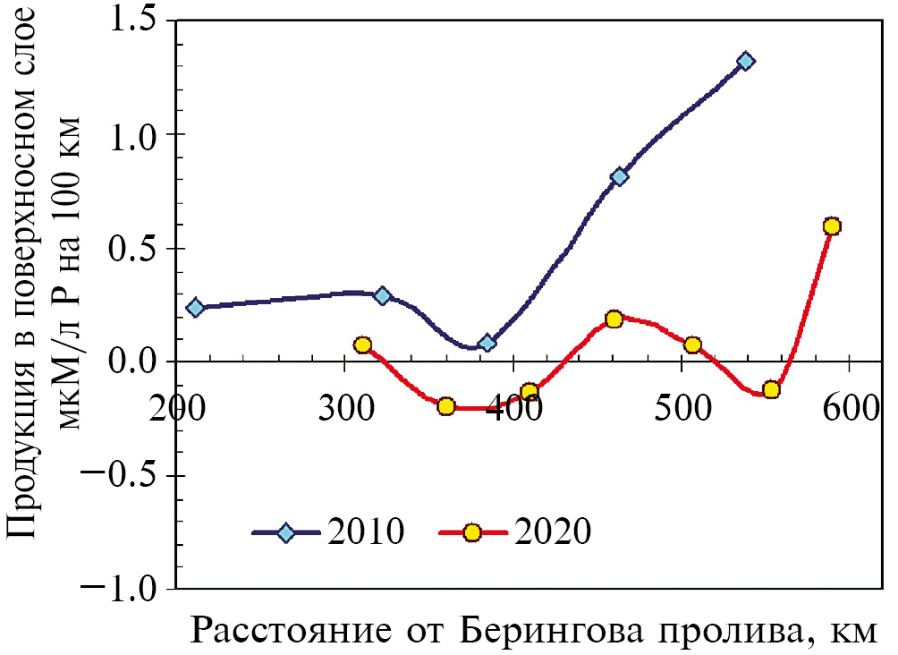 При всём различии продукционных процессов в 2010 и 2020 гг., наиболее общие закономерности утилизации аллохтонных биогенных веществ оказались схожими (рис. 6). Судя по динамике фосфора в беринговоморских водах, после вторжения в пределы Чукотского моря сначала расходуется запас верхнего слоя. После того, как этот запас исчерпывается (через 300–400 км пути, на 68–69° с. ш. в 2010 г. или через 500–600 км, на 70–71° с. ш. в 2020 г.), продукция снижается. Однако дальше по течению потока продукция вновь возрастает за счёт поступления питательных веществ из подповерхностного слоя беринговоморских вод. В 2010 г. это наблюдалось примерно на 70° с. ш., а в 2020 г. подповерхностные воды с неизрасходованным запасом фосфора уходили за пределы съёмки, предположительно этот запас утилизировался в северной части моря. Причём если в “верхней” зоне активного продуцирования продукция обеспечивалась запасом биогенных веществ, поступившим в эту зону в поверхностном слое, то в “нижней” (по течению) высокопродуктивной зоне биогены потреблялись “с колёс”, рост продукции обеспечивался усилением их перетока из подповерхностного слоя.