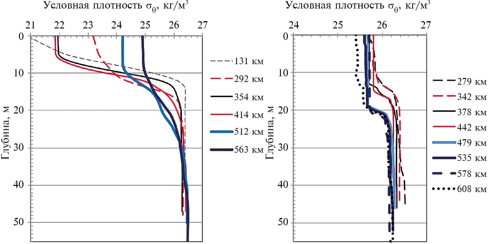 Рис. 7. Профили условной плотности на станциях, расположенных на стрежне потока беринговоморских вод в Чукотском море на разном расстоянии от Берингова пролива, по данным съёмок НИС “ТИНРО” летом 2010 г. (слева) и 2020 г. (справа)
