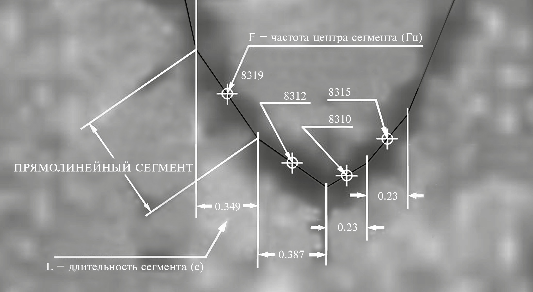Рис. 1. Спектрограмма фрагмента сигнала. Контур основного тона разбит на прямолинейные сегменты для вычисления параметра “средняя частота сигнала” (подробности в тексте).