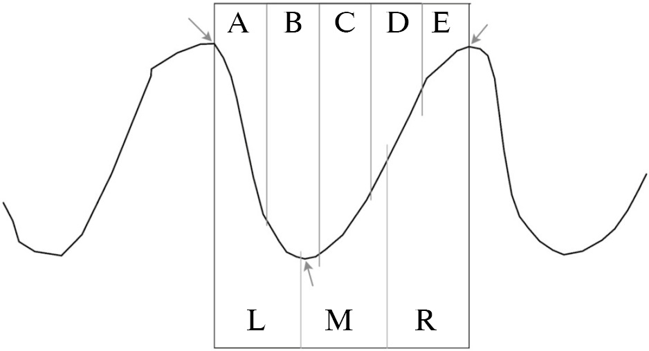 Для максимально обобщенного отображения анализируемых сигналов у каждого свиста определялся “код с позицией пика” в кодировках ABCDE и LMR. Данный код отражает количество экстремумов, порядок восходящих (обозначается “+”) и нисходящих (“–”) элементов, а также положение экстремума относительно двух соседних экстремумов (пиков). Для первого и последнего экстремумов также определялось их положение относительно начальной и конечной точки свиста соответственно. Расстояние между двумя соседними пиками в кодировке ABCDE делится на пять равных частей. Если кодируемый экстремум (пик) попадал в первую область (часть), ему присваивался код “А”, если во вторую – “В”, и так далее. Аналогично определялась кодировка LMR, только расстояние между пиками делилось уже на три части (рис. 2).