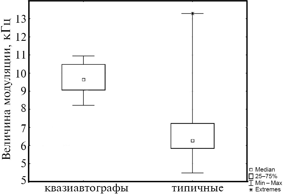 Сравнение сигналов двух подкатегорий по величине частотной модуляции (разнице между максимальной и минимальной частотой сигнала) с использованием критерия Манна–Уитни (Mann–Whitney U Test, р = 0.017) показало их значимые различия. Характер распределения данного параметра показан на рис. 9.