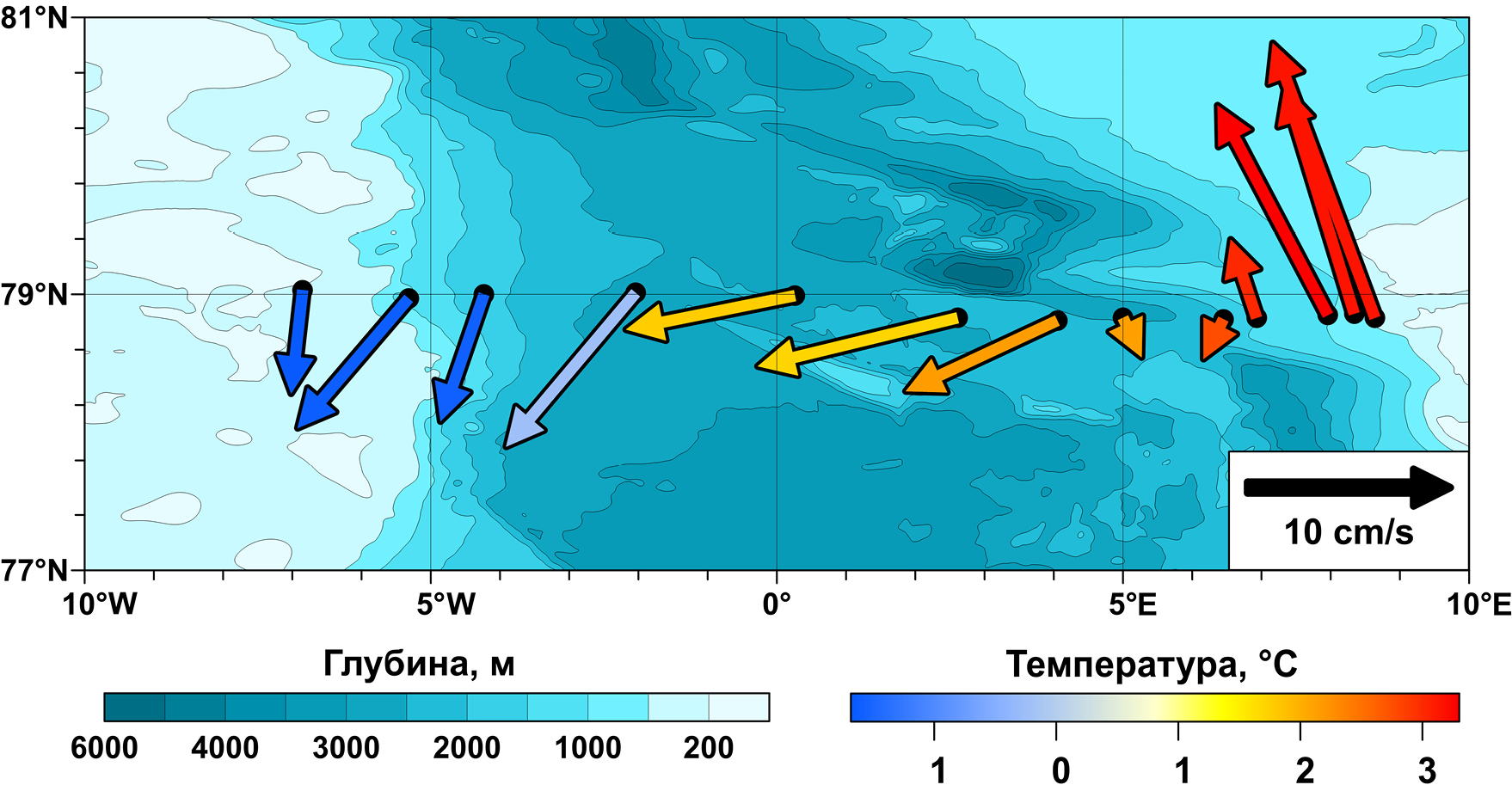 Теплая и соленая атлантическая вода на разрезе по 79° с.ш. больше смещена на запад, чем на разрезе по 75° с.ш. Это связано с рециркуляцией потока этих вод, которые занимают большее пространство в проливе Фрама, чем в южной части Гренландского моря.