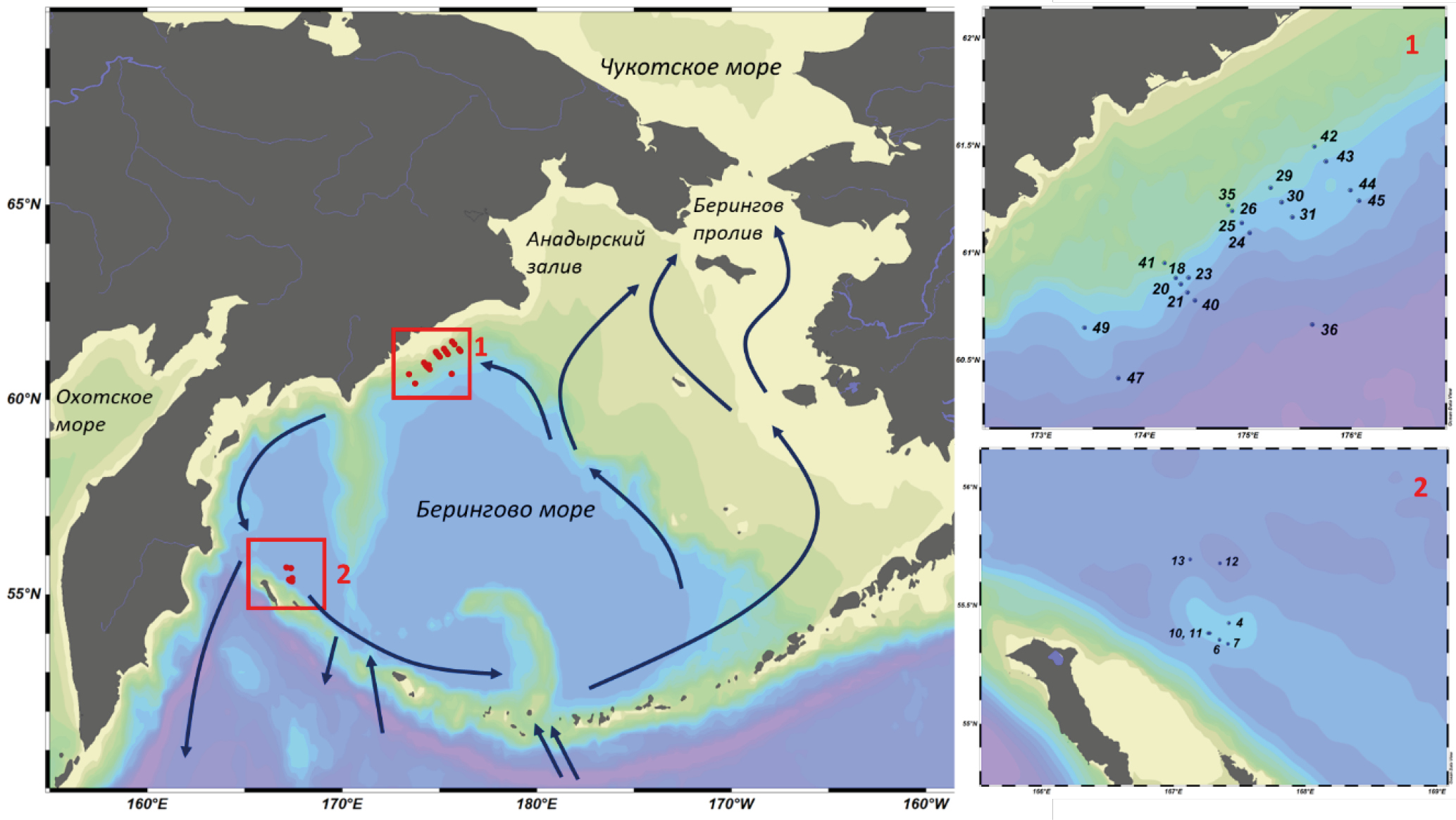 В акватории западной части Берингова моря протекает весь спектр вышеуказанных процессов, и их интенсивность неравномерно распределена по глубине водной толщи. Цель настоящей работы определить контролирующие факторы изотопного состава углерода и концентрации DIC в толще вод данной акватории. Воды Берингова моря имеют особое значение для Северного Ледовитого Океана, поскольку они богаты не только компонентами, положительно влияющими на первичную продукцию [4, 5, 10, 13, 16 и др.], но и содержат повышенные концентрации DIC, являющиеся атрибутом тихоокеанских вод. Этот фактор играет большую роль в процессах подкисления вод СЛО (acidification, например, [17, 57] и другие работы). Акватория западной части Берингова моря отличается крайне слабой изученностью в отношении изотопной геохимии вод несмотря на то, что в этой части моря находятся продуктивный Корякский шельф и Командорские острова. В целом, для Берингова моря опубликовано совсем немного изотопных данных, в основном они были получены для вод соседних акваторий: либо для севера Тихого океана [10, 19, 23, 45, 49, 51, 52], либо для тихоокеанского сектора СЛО, Чукотского моря и акваторий, примыкающих к побережью Аляски [12, 18, 36, 47 и другие работы].