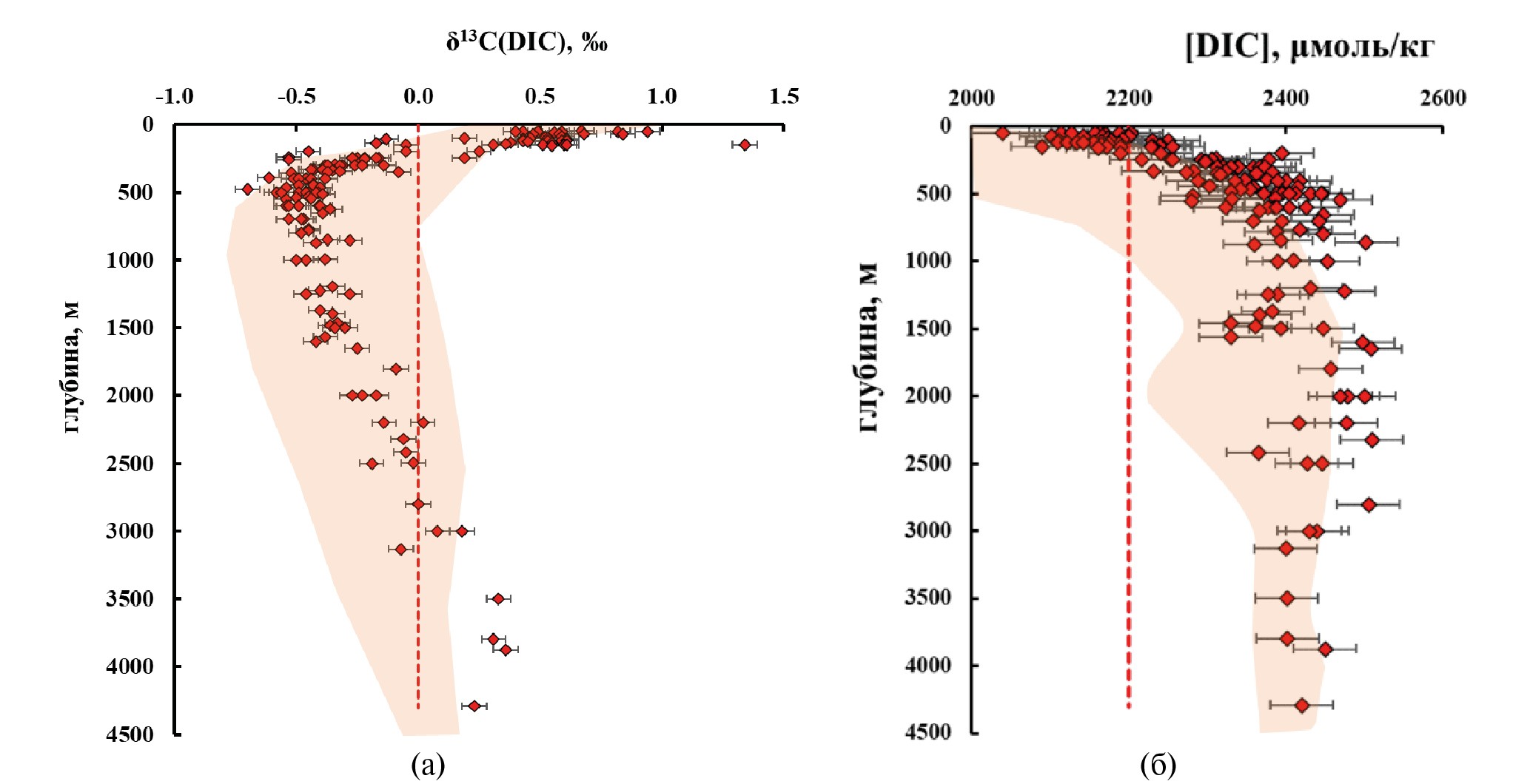 Рис. 3. Распределение с глубиной изотопного состава углерода (а) и концентрации (б) растворенного неорганического углерода (DIC) в водах западной части Берингова моря (поверхностные летние воды не показаны). Пунктиры – нулевое значение δ13С(DIC) и средняя концентрация DIC в водах океана [7]. Залитые поля – соответствующие данные для тихоокеанского разреза вдоль меридиана 150° в.д. в интервале 13–40° с.ш. (отбор 2019 г. [19]).