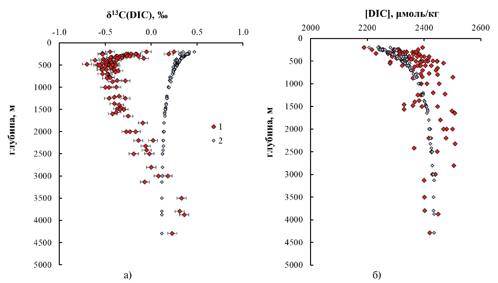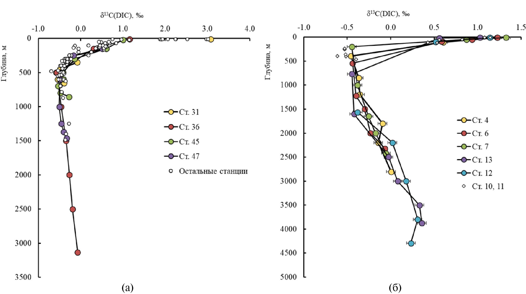 Результаты расчета в сравнении с наблюдаемыми величинами δ13С(DIC) и [DIC] показаны на рис. 8, откуда следует, что интенсивность процессов окисления органики меняется с глубиной. Максимальное отклонение измеренных величин δ13С(DIC) от расчета, соответствующее максимальной интенсивности окисления ОВ, наблюдается в области глубин ≈ 500 м. Далее интенсивность окисления ОВ постепенно снижается и становится незначительной на глубине ≈ 3000 м (рис. 8а). Концентрационный сдвиг [DIC] вправо от расчетного тренда поддерживает вывод о преобладании окисления ОВ во всем интервале промежуточных и глубинных вод (рис. 8б).