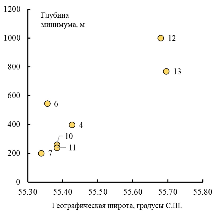 Рис. 5. Глубина положения δ13С(DIC)-минимума в районе Командорских островов в зависимости от географической широты.