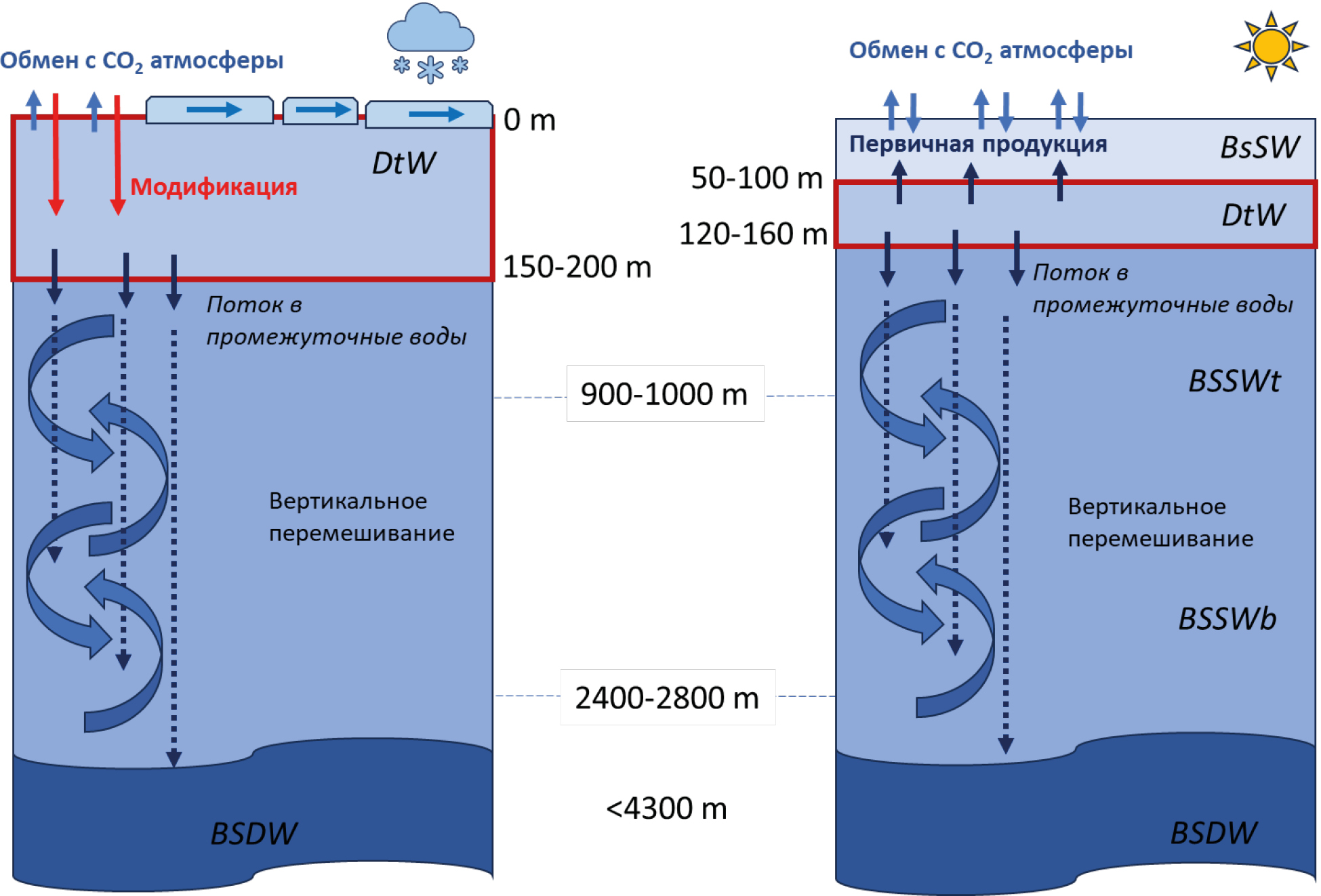 Рис. 11. Схема вертикального переноса растворенного неорганического углерода (“физический насос”) через слой дихотермальных вод (DtW) и его дальнейшего распределения в водной толще западной части Берингова моря в летнее и зимнее время.