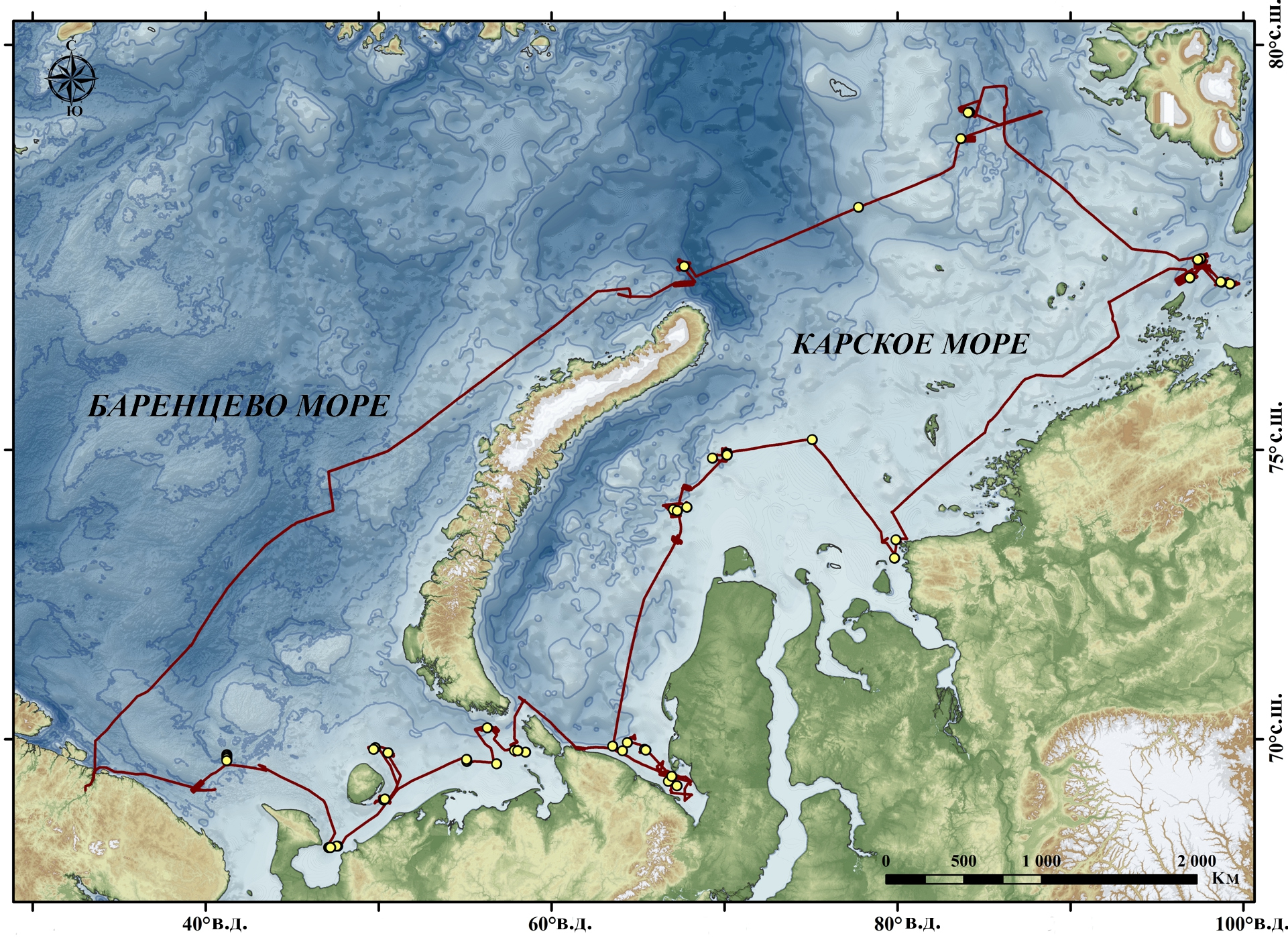 Рис. 1. Схема работ 1-го этапа 56-го рейса НИС “Академик Николай Страхов”. Маршрут движения судна показан коричневой линией, выполненные комплексные станции – желтыми кружками.