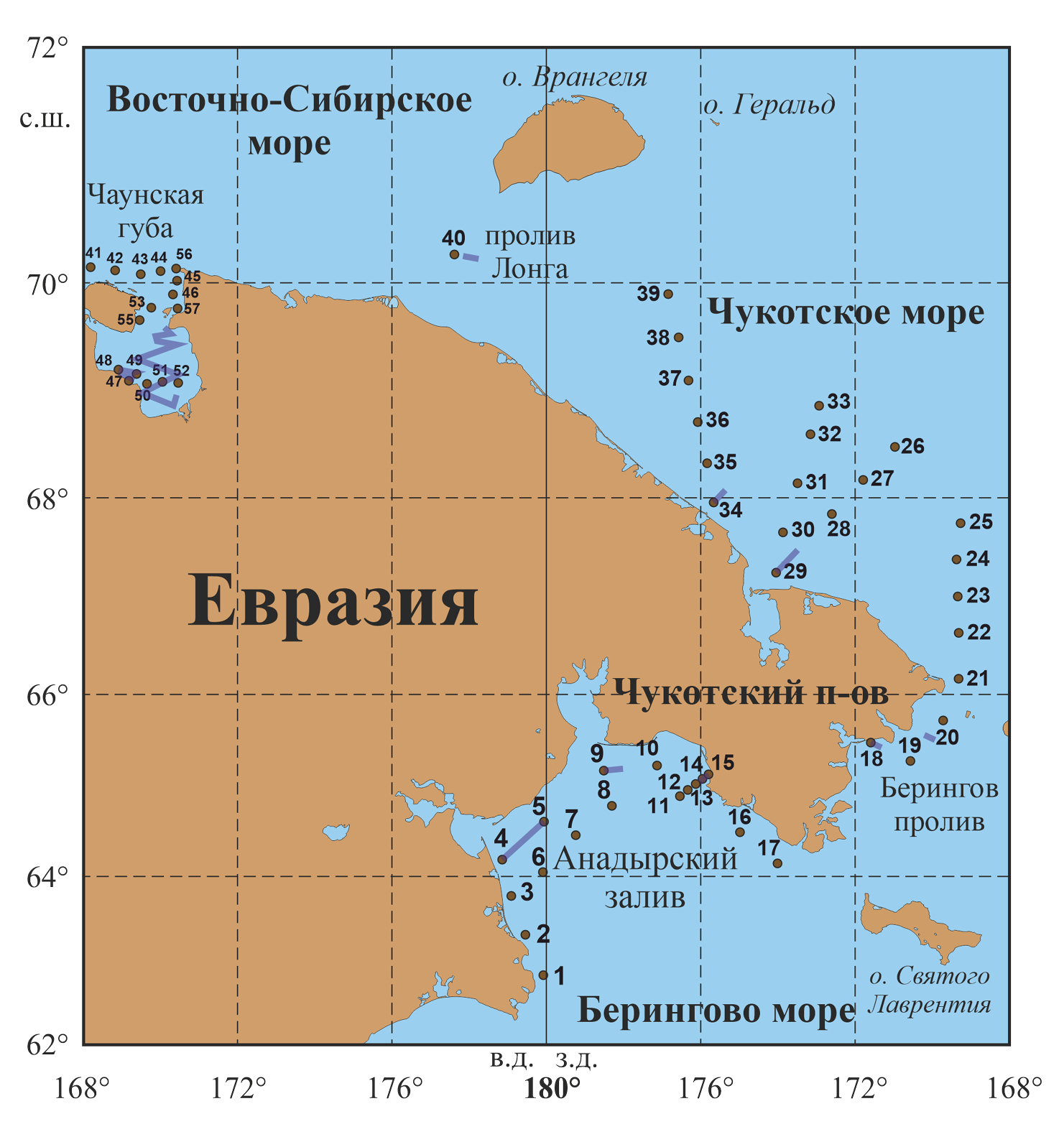 Цель экспедиции – изучение механизмов формирования высокопродуктивных акваторий морей северо-востока Евразии и оценка их современного экологического состояния по комплексу гидрологических, гидрохимических, геологических, радиогеохимических, гидрологических и гидробиологических данных, полученных на полигонах и по маршруту судна (рис. 1). География исследований охватывала Берингово (Анадырский залив, Берингов пролив), Чукотское и Восточно-Сибирское (пролив Лонга, Чаунская губа) моря. Проведенная экспедиция является продолжением ранее проведенных комплексных исследований Чаунской губы [1, 2]. Общая протяженность переходов экспедиции составила 4390 морских миль (8130 км).