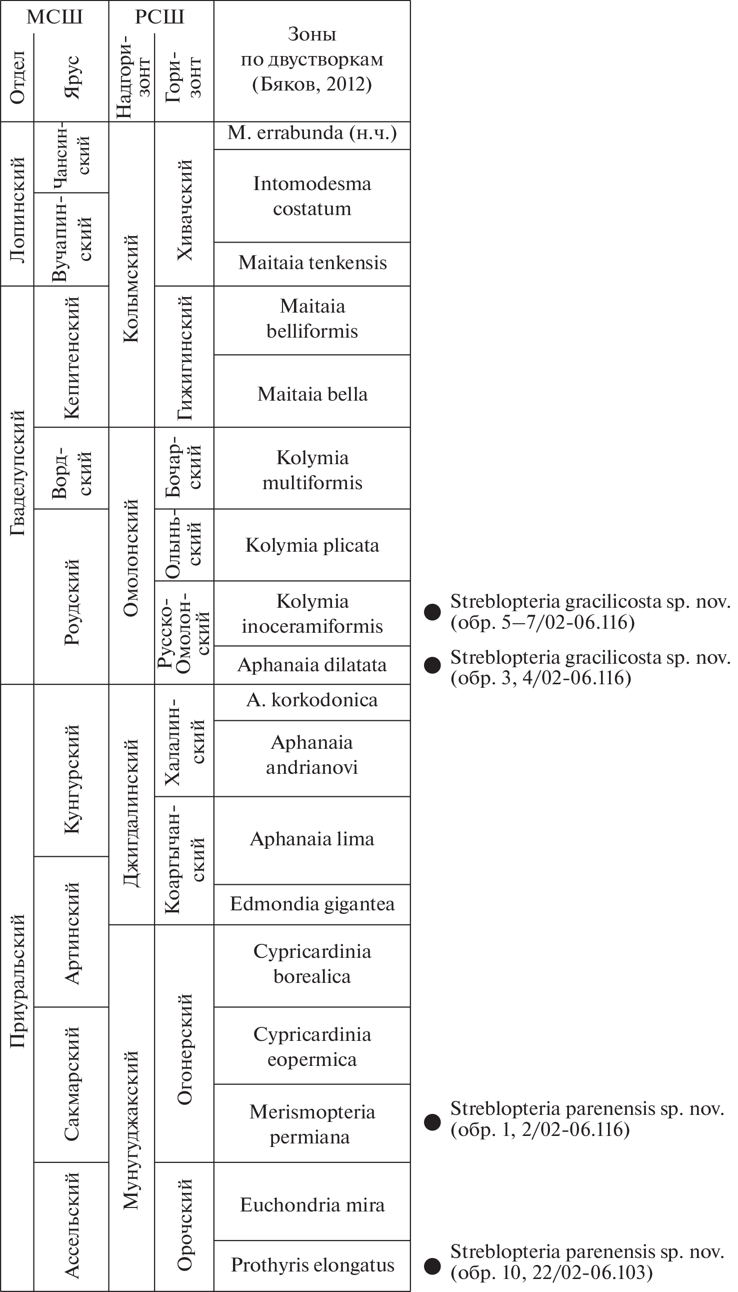 The problems of taxonomy of Permian pectinoid bivalves are briefly considered in the context of the study well-known Upper Paleozoic genus Streblopteria M’Coy and its historical development in Northeast Russia. Two new stratigraphically important species have been described from the Lower and Middle Permian deposits of the Omolon massif: S. parenensis sp. nov. and S. gracilicosta sp. nov.