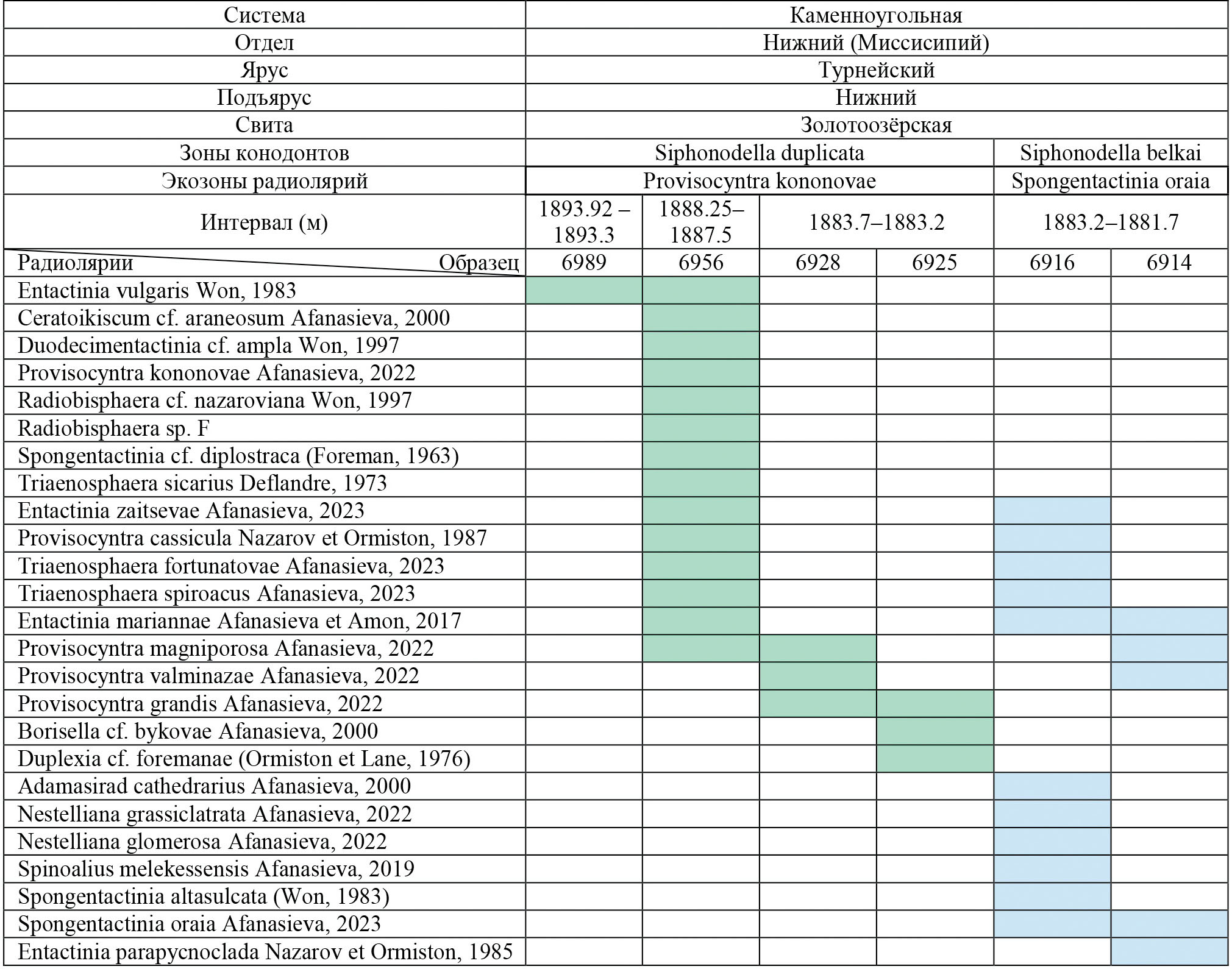 Рис. 5. Распространение радиолярий в нижнетурнейских отложениях золотоозерской свиты скв. Мелекесская-1 (по М.С. Афанасьевой из: Фортунатова и др., 2023, рис. 68 с изменением и дополнением). Цветом выделены интервалы распространения радиолярий в двух экозонах.