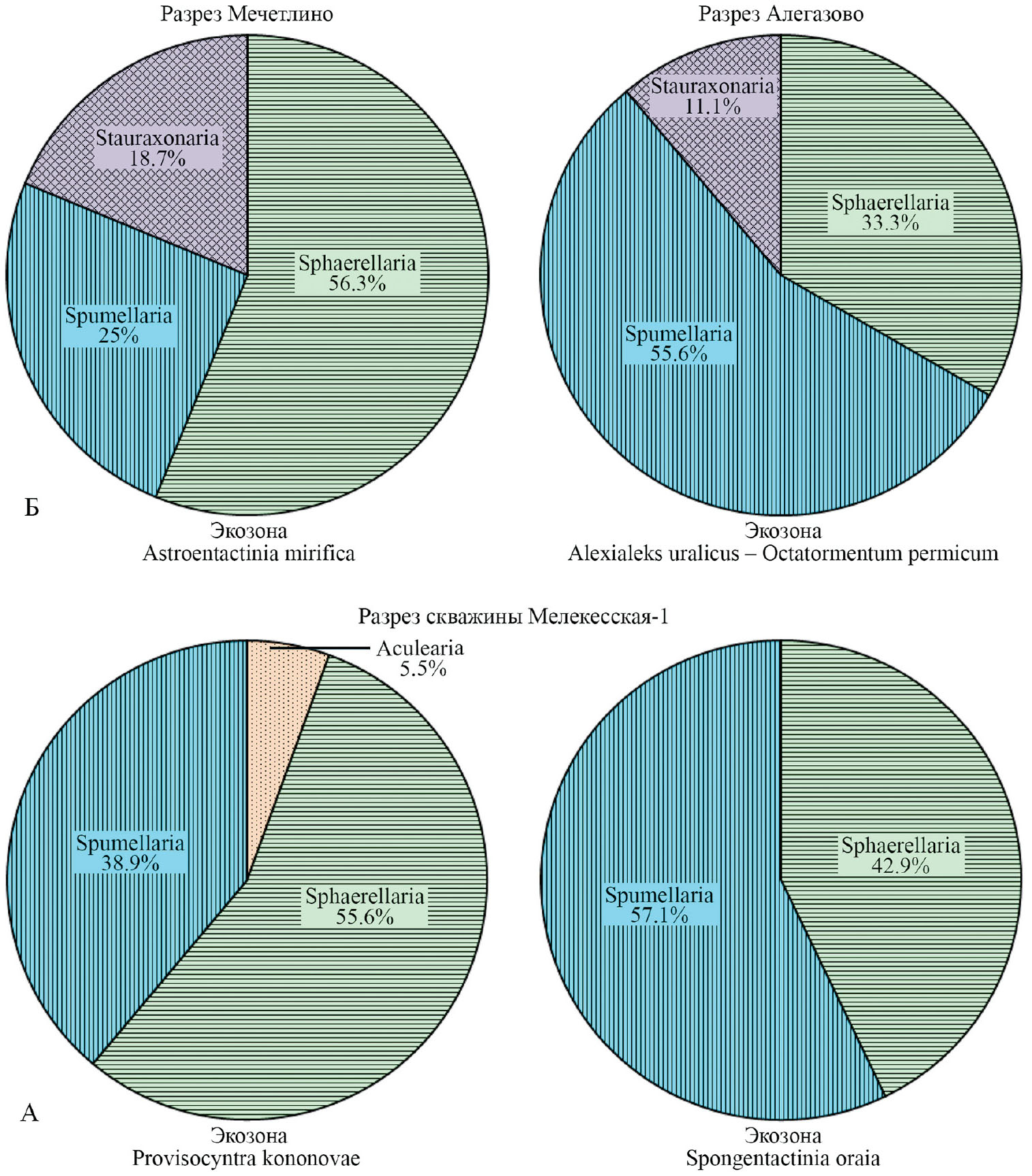 Рис. 7. Соотношение классов радиолярий в экозонах раннего турне нижнего карбона в скв. Мелекесская-1 (А) и кунгурского яруса нижней перми в разрезах Мечетлино и Алегазово (Б).