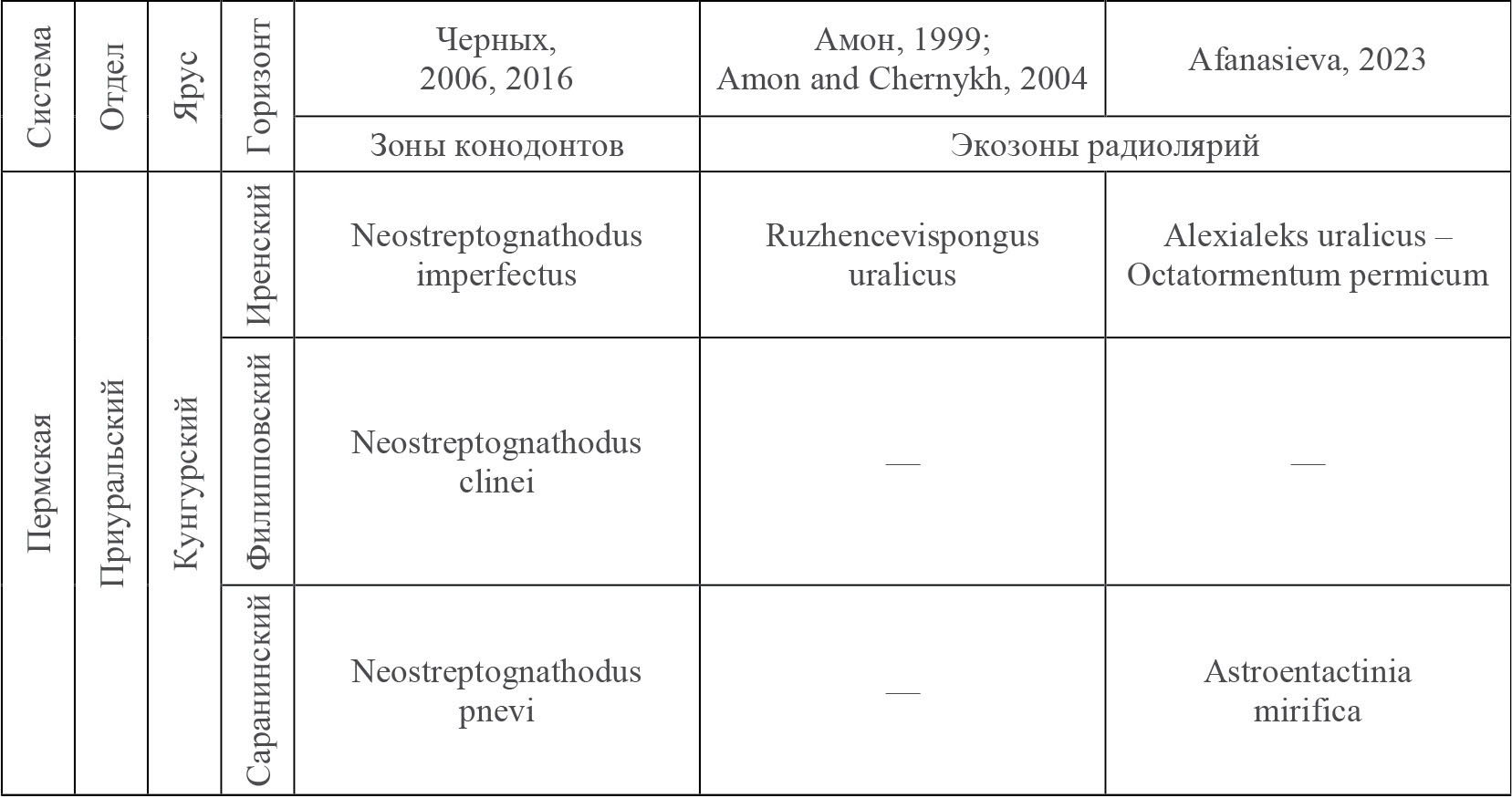 Э.О. Амон (Амон, 1999) установил в разрезе иренского горизонта на р. Ай у с. Алегазово монотаксонный комплекс радиолярий в ранге “слоев с фауной” (рис. 10), основанный на присутствии только одного вида Ruzhencevispongus uralicus, описанного в статье Коцура (Kozur, 1980). Однако, к сожалению, Амон в своих работах (Амон, 1999; Amon, Chernykh, 2004) не сослался на статью Назарова и Ормистона (Nazarov, Ormiston, 1986), которые уже установили монотаксонную ассоциацию Ruzhencevispongus uralicus, и не проанализировал великолепный комплекс радиолярий кунгура, описанный Коцуром и Мостлером (Kozur, Mostler, 1989).