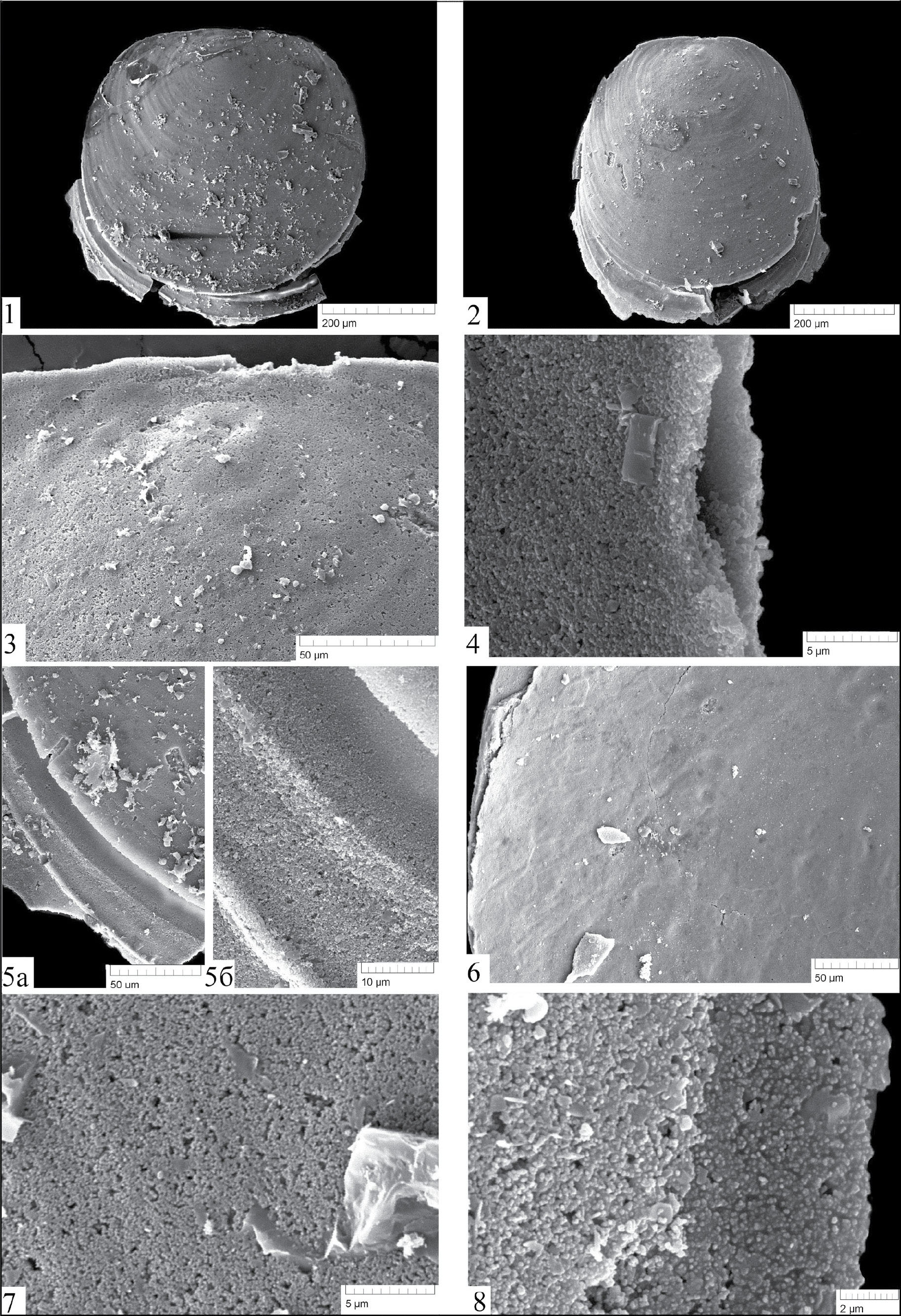 Фиг. 1–8. Praeoehlertella umbrosa Mergl, 2001: 1, 5, 7, 8 – экз. ПИН, № 5870/1: 1 – спинная створка округлых очертаний; 5а, 5б – линии роста на боковой части спинной створки: 5а – толщина линий роста 15–17 мкм; 7 – гранулированная микроструктура вторичного слоя, отдельные гранулы и грозди гранул; 8 – гранулированная микроструктура вторичного слоя; поры размерами 0.3 мкм, пластины внутри микрогранулированного слоя, пластины ориентированы почти перпендикулярно к поверхности створки, отдельные гранулы размером 0.1 мкм и грозди гранул; 2, 3 – экз. ПИН, № 5870/2: 2 – спинная створка округло-овального очертания; 3 – примакушечная часть створки без первичного слоя с плохо выраженным протегулюмом и брефической раковиной; 4, 6 – экз. ПИН, № 5870/3: 4 – двухслойное строение створки, гранулированный слой с пластинками; 6 – фрагмент внутренней стороны створки с ромбовидными отпечатками внутреннего эпителия; Казахстан, Актюбинская обл., разрез Шийли-Сай-1; верхний девон, фаменский ярус.