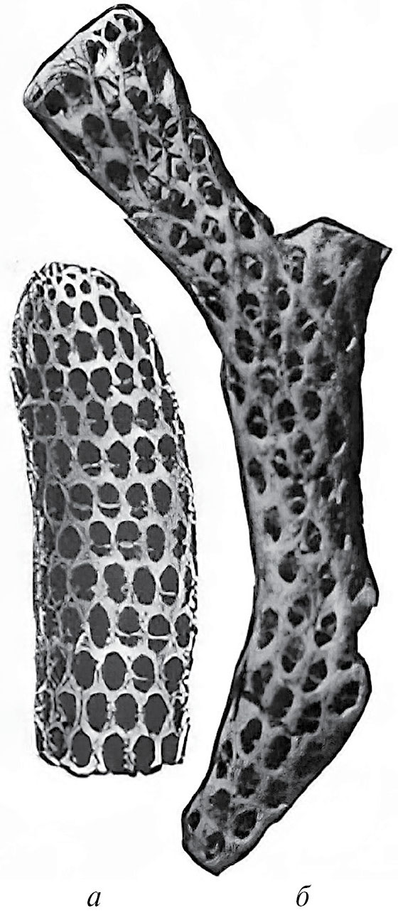 Рис. 1. Шарнирные линии (hingelines) в поверхностно разрушенных автозооидах мшанок двух видов Eleidae: а – Meliceritites gracilis (Goldfuss, 1821); сеноман Германии (по: Taylor, 2022a, с. 27, рис. 5, c); б – Elea taylori Viskova, 2011, голотип ПИН, № 5038/50; часть билатеральной ветви колонии (×12); Россия, Московская обл., карьер между пос. Трошково – Речицы; средняя юра, средний келловей.