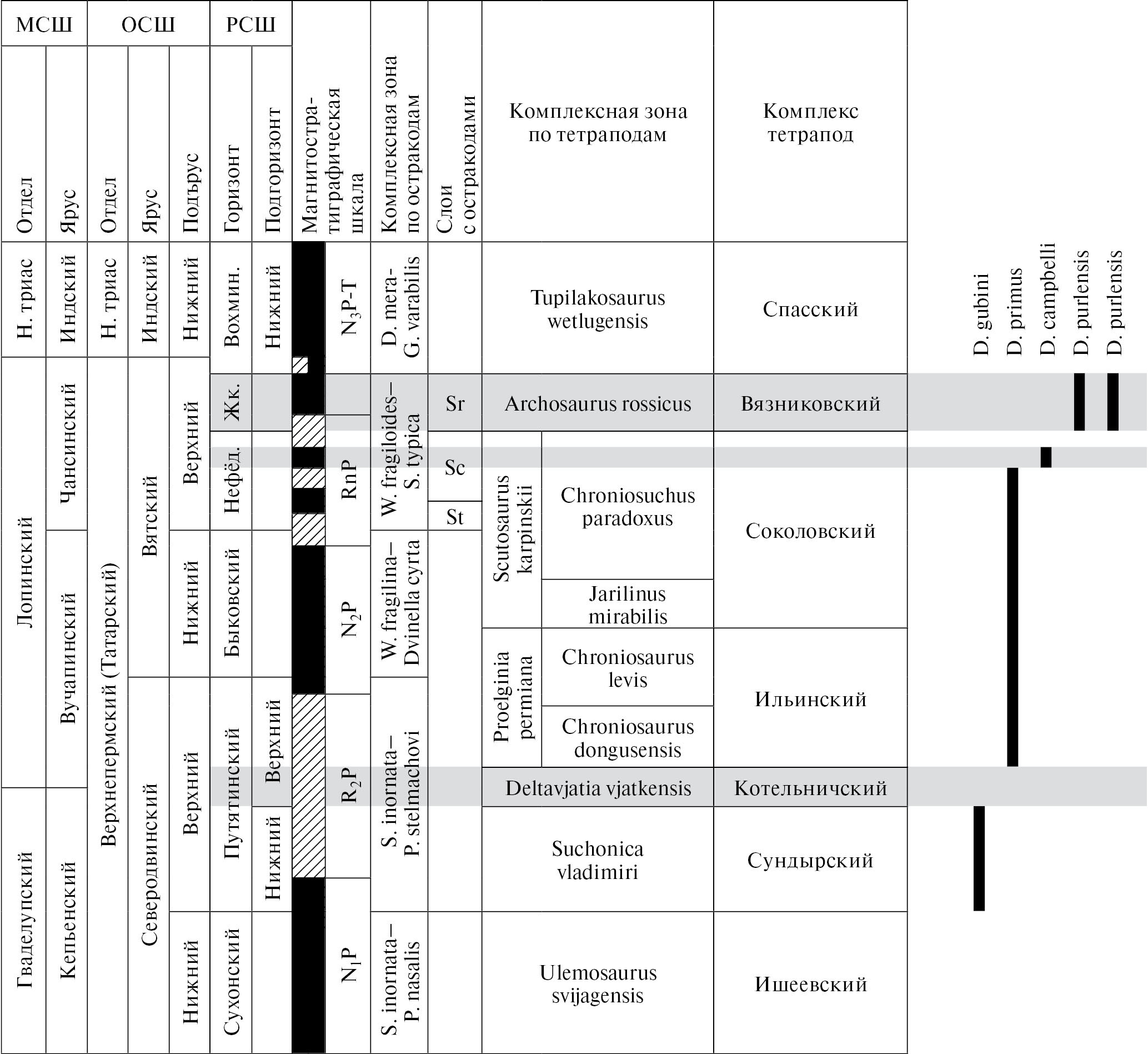 Рис. 1. Стратиграфическое распространение представителей рода Dvinosaurus в верхнепермских отложениях Восточной Европы. Сокращения: Вохмин. – Вохминский, Жк. – Жуковский, МСШ – Международная стратиграфическая шкала, Н.триас – Нижнетриасовый, Нефед. – Нефедовский, ОСШ – Общая стратиграфическая шкала России, РСШ – Региональная стратиграфическая шкала, D. mera–G. variabilis – Darwinula mera–Gerdalia variabilis; S. inornata–P. nasalis – Suchonellina inornata–Prasuchonella nasalis; S. inornata–P. stelmachovi – Suchonellina inornata–Prasuchonella stelmachovi; St – Suchonella typica; Sc – Suchonella clivosa; Sr – Suchonella rykovi; W. fragilina–Dvinella cyrta – Wjatkellina fragilina–Dvinella cyrta; W. fragiloides– S. typica – Wjatkellina fragiloides–Suchonella typica.