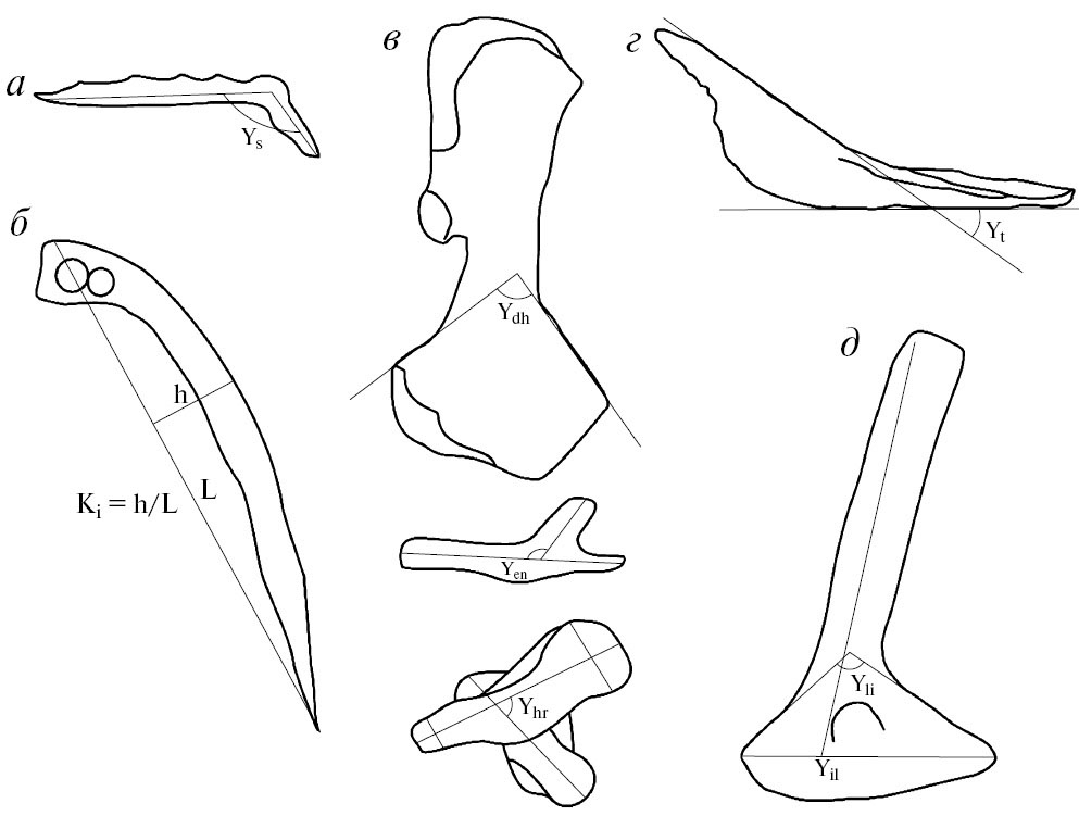 В работе учитывались следующие морфологические параметры (рис. 3): угол отогнутости скулового отдела черепа (угол между покровной плоскостью squamosum и плоскостью ее шовной области, Ys), угол тыльного наклона дорсального отростка ключицы (угол между ключичной пластиной и ее дорсальным отростком, Yt), угол схождения боковых сторон медиального надмыщелка humerus (Ydh), энтэпикондилярный угол (угол между плоскостью медиального надмыщелка и эктэпикондилярным гребнем humerus, Yen), угол скрученности плечевой кости (угол между средними линиями проксимального и дистального концов humerus, Yhr), угол наклона верхнего отростка ilium (Yil), угол между боковыми сторонами расширенного основания ilium (Yli).