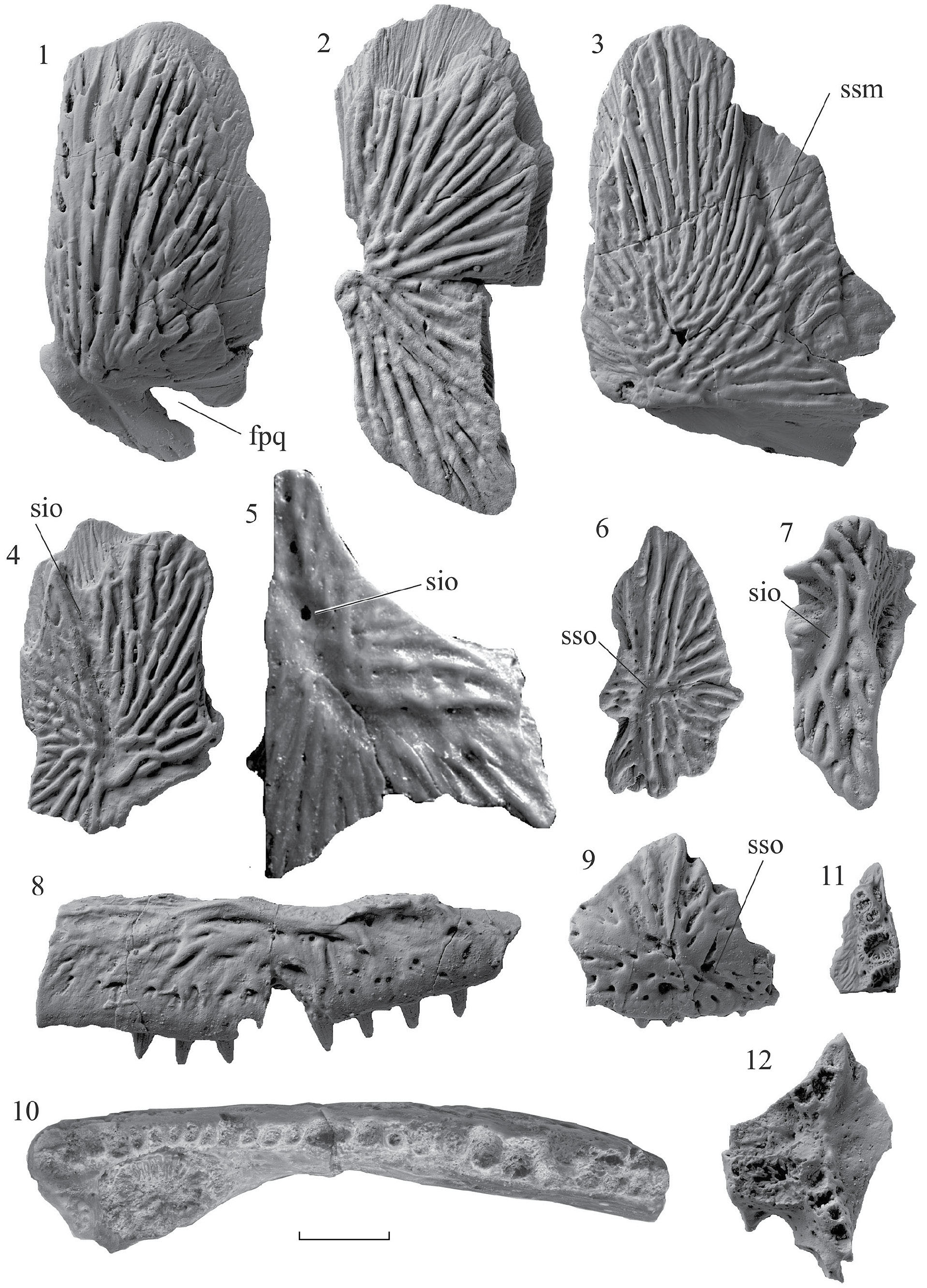 Фиг. 1–12. Dvinosaurus gubini sp. nov.: 1 – quadratojugale sin., экз. ПИН, № 5388/47; 2 – parietale dex., экз. ПИН, № 5388/390; 3 – squamosum dex., экз. ПИН, № 5388/203; 4 – supratemporale sin., экз. ПИН, № 5388/451; 5 – jugale sin., экз. ПИН, № 5388/4; 6 – frontale sin., экз. ПИН, № 5388/470; 7 – lacrimale sin., экз. ПИН, № 5388/452; 8 – maxillare dex., экз. ПИН, № 5388/400; 9 – praemaxillare sin., экз. ПИН, № 5388/406; 10 – dentale dex., экз. ПИН, № 5388/493; 11 – transversum sin., экз. ПИН, № 5388/490; 12 – vomer dex., экз. ПИН, № 5388/456; Республика Марий Эл, Горномарийский р-н, местонахождение Сундырь-1; верхняя пермь, нижняя часть верхнесеверодвинского подъяруса, нижнепутятинский подгоризонт, зона Suchonica vladimiri. Обозначения: fpq – foramen paraquadratum, sio – sulcus infraorbitalis, ssm – sulcus supramaxillaris, sso – sulcus supraorbitalis. Длина масштабной линейки 5 мм.