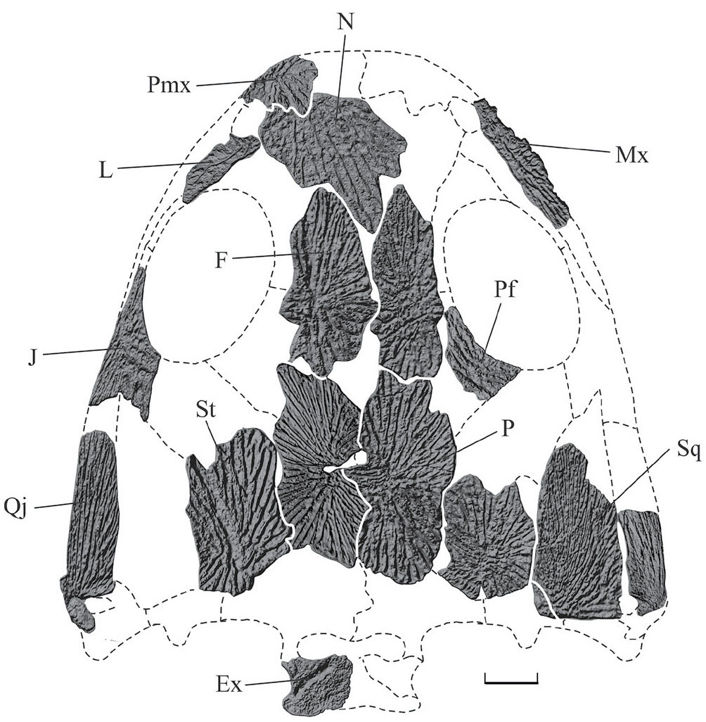 Рис. 4. Dvinosaurus gubini sp. nov., череп с дорсальной стороны, реконструкция по экз. ПИН, №№ 5388/4, 21, 47, 203, 324, 389, 394, 402, 406, 451–453, 457, 470, 471, 481. Обозначения: Ex – exoccipitale, F – frontale, J – jugale, L – lacrimale, Mx – maxillare, N – nasale, P – parietale, Pf – postfrontale, Pmx – praemaxillare, Qj – quadratojugale, Sq – squamosum, St – supratemporale. Длина масштабной линейки 10 мм.