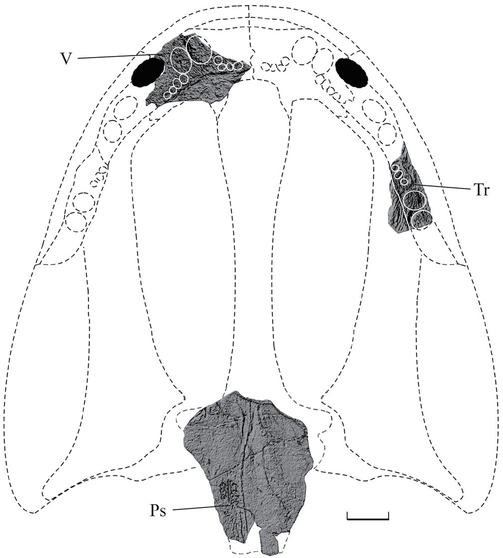 Рис. 5. Dvinosaurus gubini sp. nov., череп с вентральной стороны, реконструкция по экз. ПИН, №№ 5388/450, 456, 490. Обозначения: Ps – parasphenoideum, Tr – transversum, V – vomer. Длина масштабной линейки 10 мм.