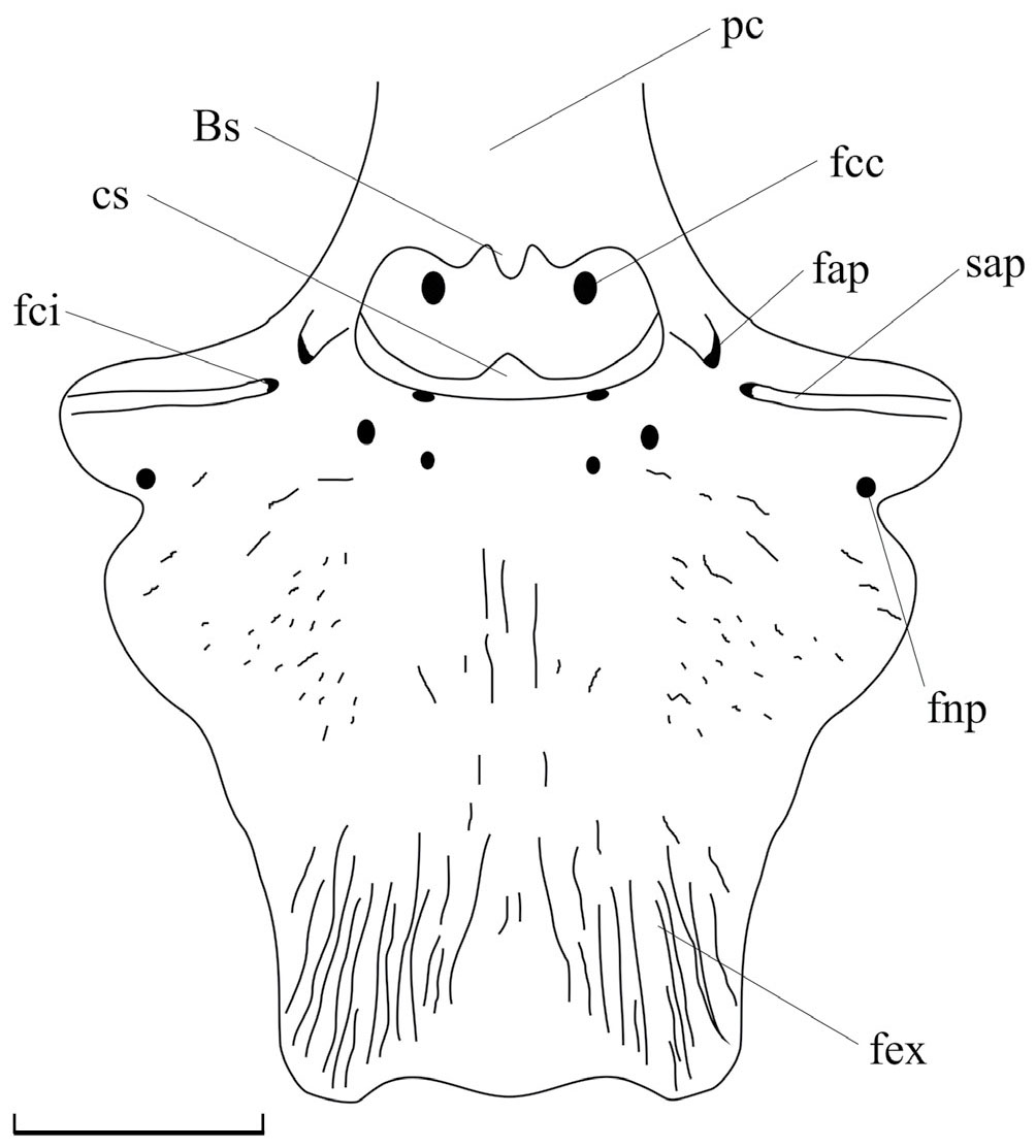 Рис. 6. Dvinosaurus gubini sp. nov., parasphenoideum с basisphenoideum с дорсальной стороны, реконструкция по экз. ПИН, №№ 5388/388, 391, 450. Обозначения: Bs – basisphenoideum, cs – crista sellaris, fap – foramen arteria palatina, fcc – foramen arteria carotis cerebralis, fci – foramen arteria carotis interna, fex – facies exoccipitalis, fnp – foramen nervus palatinus VII, pc – processus cultriformis, sap – sulcus arteria palatina. Длина масштабной линейки 10 мм.