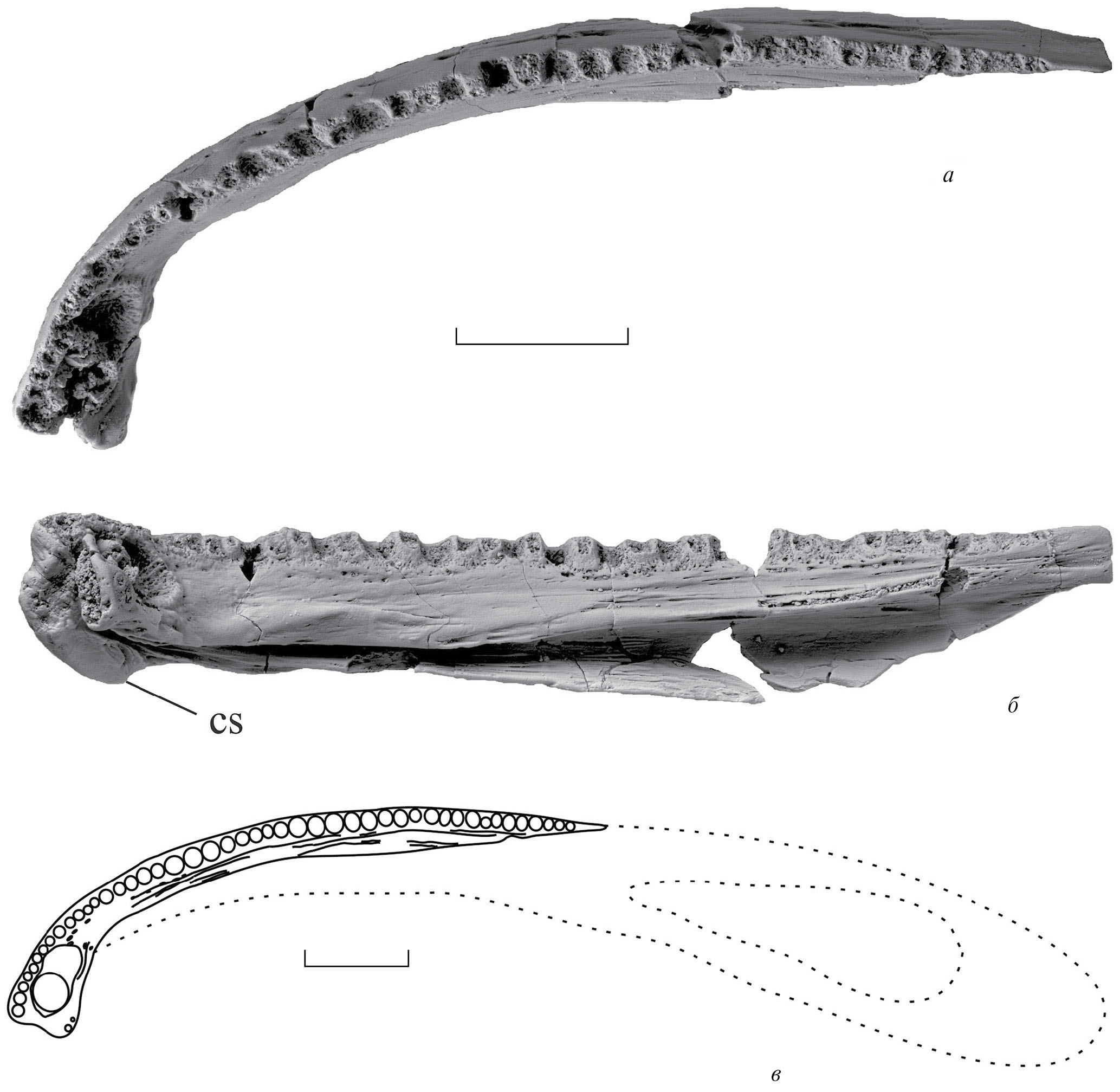 Рис. 7. Dvinosaurus gubini sp. nov., голотип ПИН, № 5388/445, правое dentale: а – сверху, б – с лингвальной стороны, в – реконструкция правой ветви нижней челюсти по голотипу № 5388/445, вид сверху. Обозначения: cs – crista symphisis. Длина масштабной линейки 10 мм.