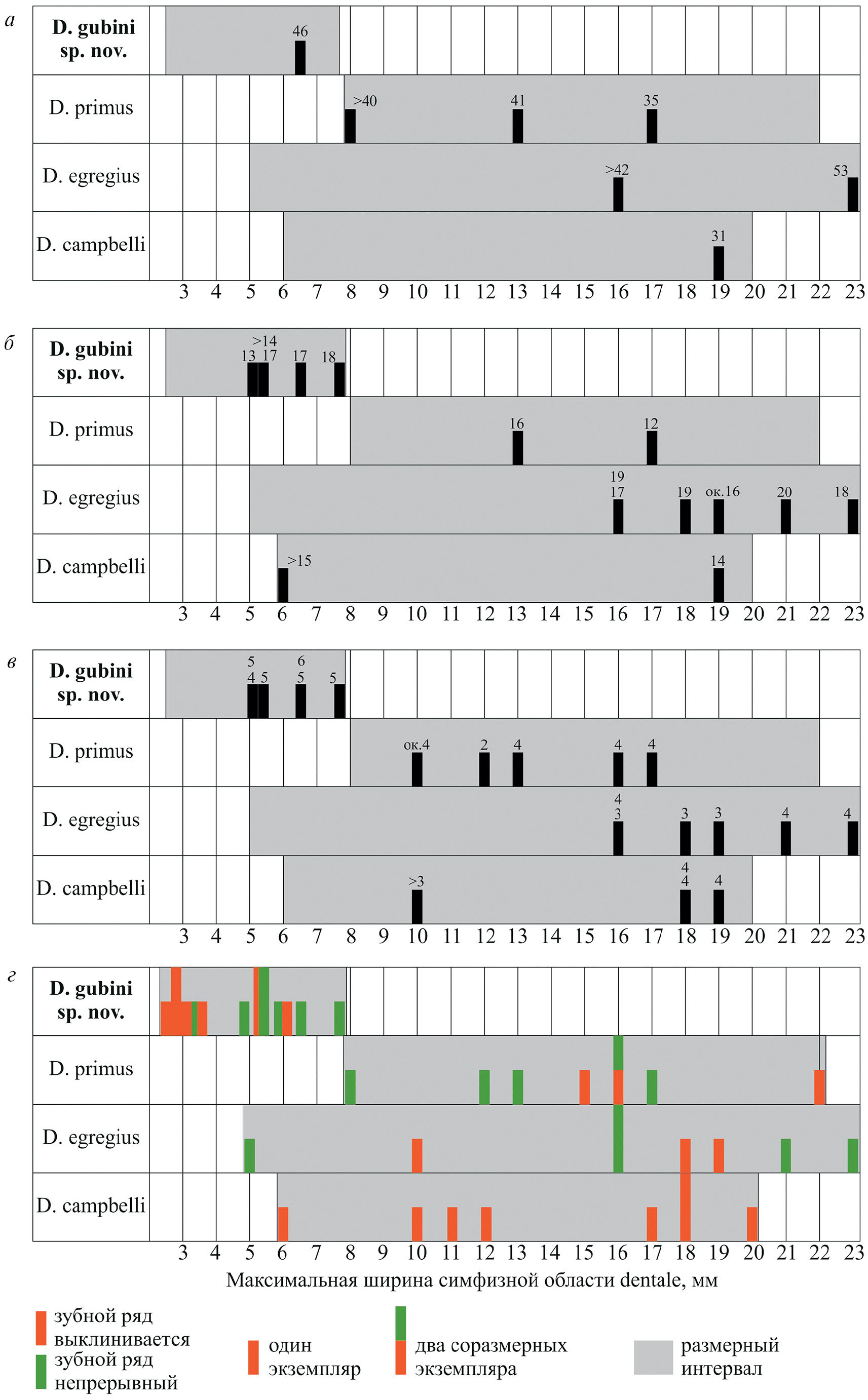 Рис. 8. Сравнение характера озубления dentale D. gubini sp. nov. с другими двинозаврами: а – общее число зубов на dentale, б – число зубов на dentale от переднего конца симфизной области до первого увеличенного зуба в ряду, в – число увеличенных зубов в ряду на dentale, г – выклинивание зубного ряда у пары симфизных клыков.