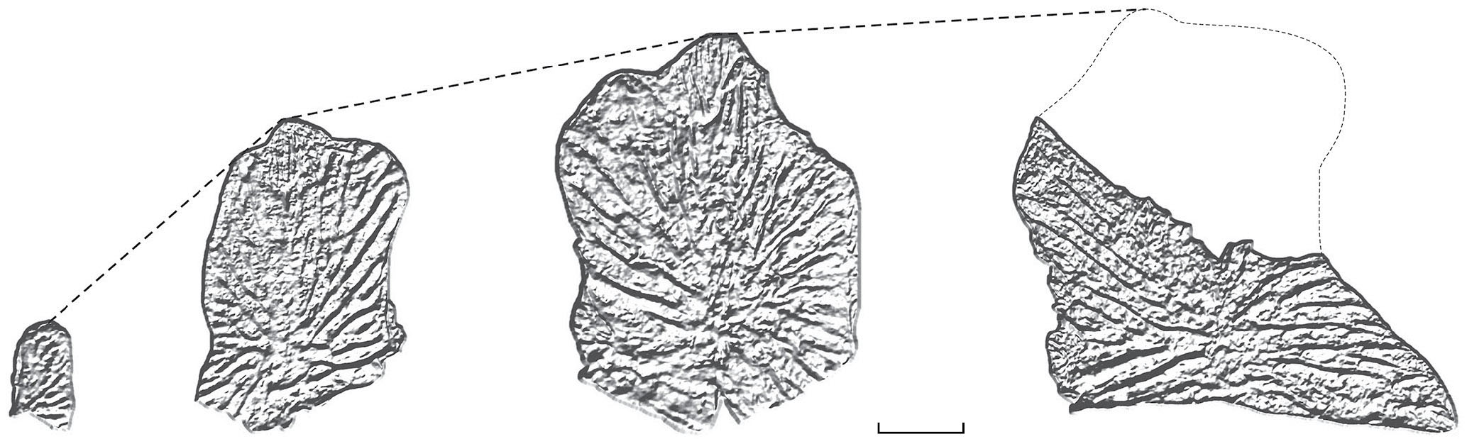Рис. 9. Размерный ряд supratemporalia (слева направо: экз. ПИН, №№ 5388/492, 451, 324, 392). Длина масштабной линейки 5 мм.