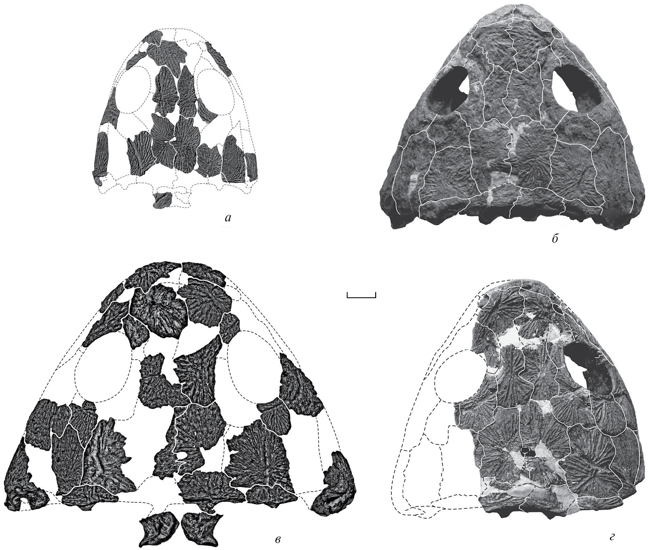 Рис. 10. Наиболее крупноразмерные черепа представителей рода Dvinosaurus: а – D. gubini sp. nov. (реконструкция), б – D. primus (экз. ПИН, № 2005/45), в – D. campbelli (реконструкция; из: Ульяхин, 2019), г – D. egregius (голотип ПИН, № 1100/23). Длина масштабной линейки 20 мм.