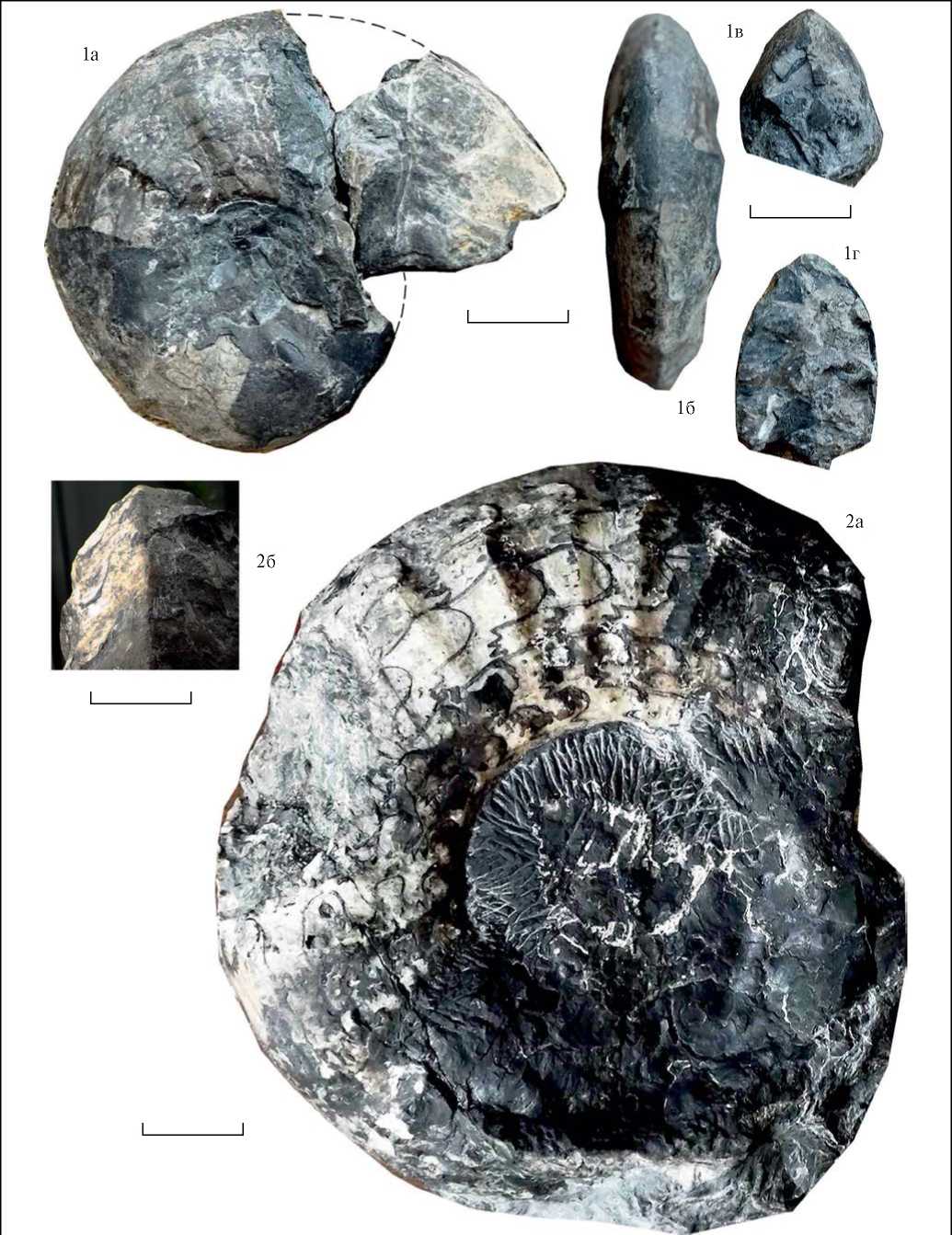 Фиг. 1, 2. Churkites subungunensis sp. nov.: 1 – голотип ДВГИ, № 110/853: 1a – сбоку, 1б – с вентральной стороны, 1в – поперечное сечение оборота при Д = 96 мм, 1г – поперечное сечение оборота при Д = 116 мм; 2 – экз. ДВГИ, № 111/853: 2a – сбоку, 2б – участок вентральной стороны при Д = 160 мм; Южное Приморье, Западный СМИД; нижний триас, оленекский ярус, смитский подъярус (верхнесмитская зона Anasibirites nevolini). Длина масштабной линейки 20 мм.