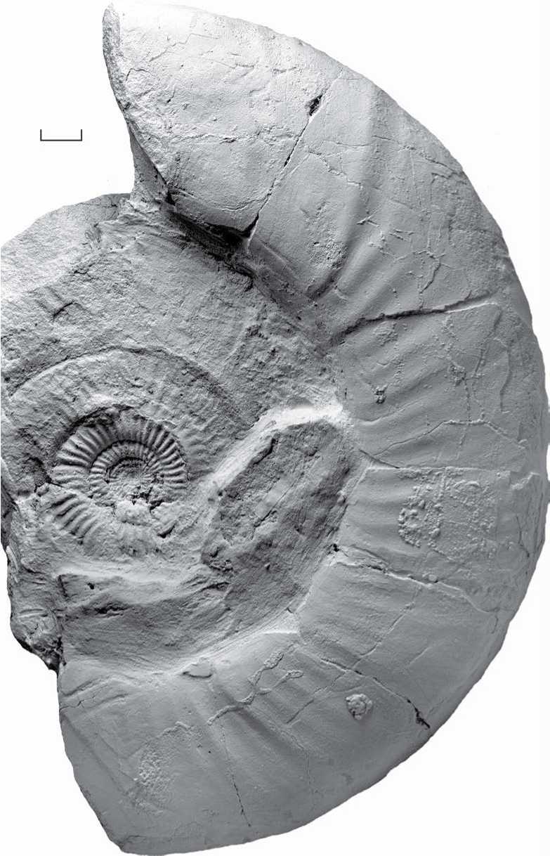 Рис. 4. Vermisphinctes aff. martiusii (d’Orbigny) [M], экз. ПИН, № 5546/290, жилая камера с частично сохранившимися внутренними оборотами, сбоку; Карачаево-Черкесия, Зеленчукский р-н, р. Бол. Зеленчук ниже станицы Зеленчукская, местонахождение 34; верхний байос, зона Niortense, подзона Rostovtsevi, фаунистический горизонт graebensteini; сб. автора, 2017 г. Масштабная линейка 10 мм.