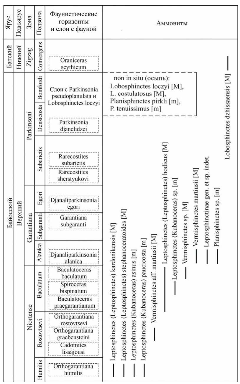 Род Leptosphinctes распространен преимущественно в низах верхнего байоса (зона Niortense), хотя первое его появление зафиксировано в самых верхах нижнего байоса (Pavia, 1973; Galacz, 2012). Первые северокавказские представители этого рода были отмечены из обнажения на левом берегу Кубани выше ст. Красногорская (Затворницкий, 1914; Кахадзе, Зесашвили, 1955, 1956; Безносов, Митта, 1993, 1998). Недавняя ревизия лептосфинктин из низов этого разреза (местонахождения 20 и 21) на новом обширном материале показала, что они представлены Leptosphinctes (Leptosphinctes) kardonikensis (Kakhadze et Zessashwili) [M], L. (L.) stephanoceratoides (Kakhadze et Zessashwili) [M], L. (Kubanoceras) asinus (Zatwornitzky) [m] и L. (K.) paucicosta (Kakhadze et Zessashwili) [m] (Митта, 2021а). Интервал распространения этих и ассоциированных аммонитов обособлен как фаунистический горизонт Orthogarantiana humilis – нижний в подзоне Humilis зоны Niortense (Mitta, 2021).