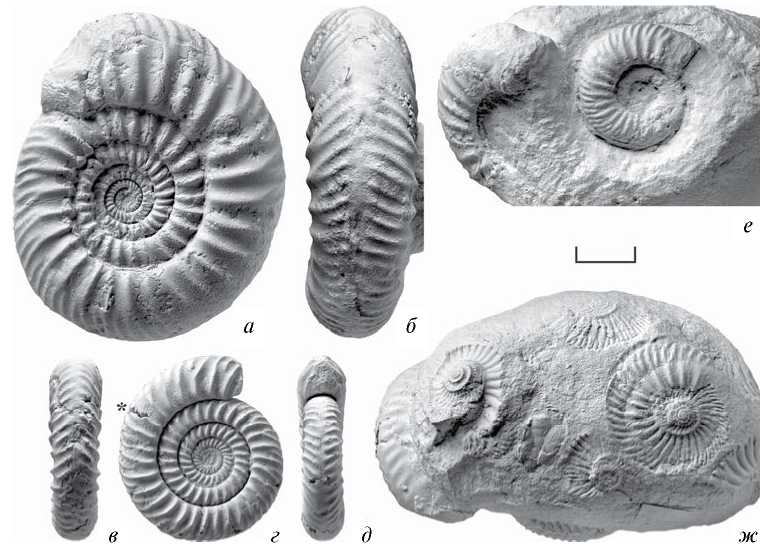 Рис. 6. Caumontisphinctes: а, б – C. (Caumontisphinctes) sp. [M], экз. ПИН, № 5546/337, фрагмокон: а – сбоку, б – с вентральной стороны; в–д – C. (Infraparkinsonia) aff. gruibingensis Dietl [m], экз. ПИН, № 5546/190, фрагмокон с начальной частью жилой камеры: в – с вентральной стороны, г – сбоку, д – с устья; е, ж– конкреция с раковинами и отпечатками C. (Infraparkinsonia) aff. phaulus Buckman [m], экз. ПИН, № 5546/299; Карачаево-Черкесия, Зеленчукский р-н, р. Кяфар ниже ст. Сторожевая, местонахождение 17; верхний байос, зона Niortense, подзона Baculatum, а–д – фаунистический горизонт bispinatum, е, ж – фаунистический горизонт baculatum; сб. автора. Масштабная линейка 10 мм; звездочкой (*) отмечено начало жилой камеры.