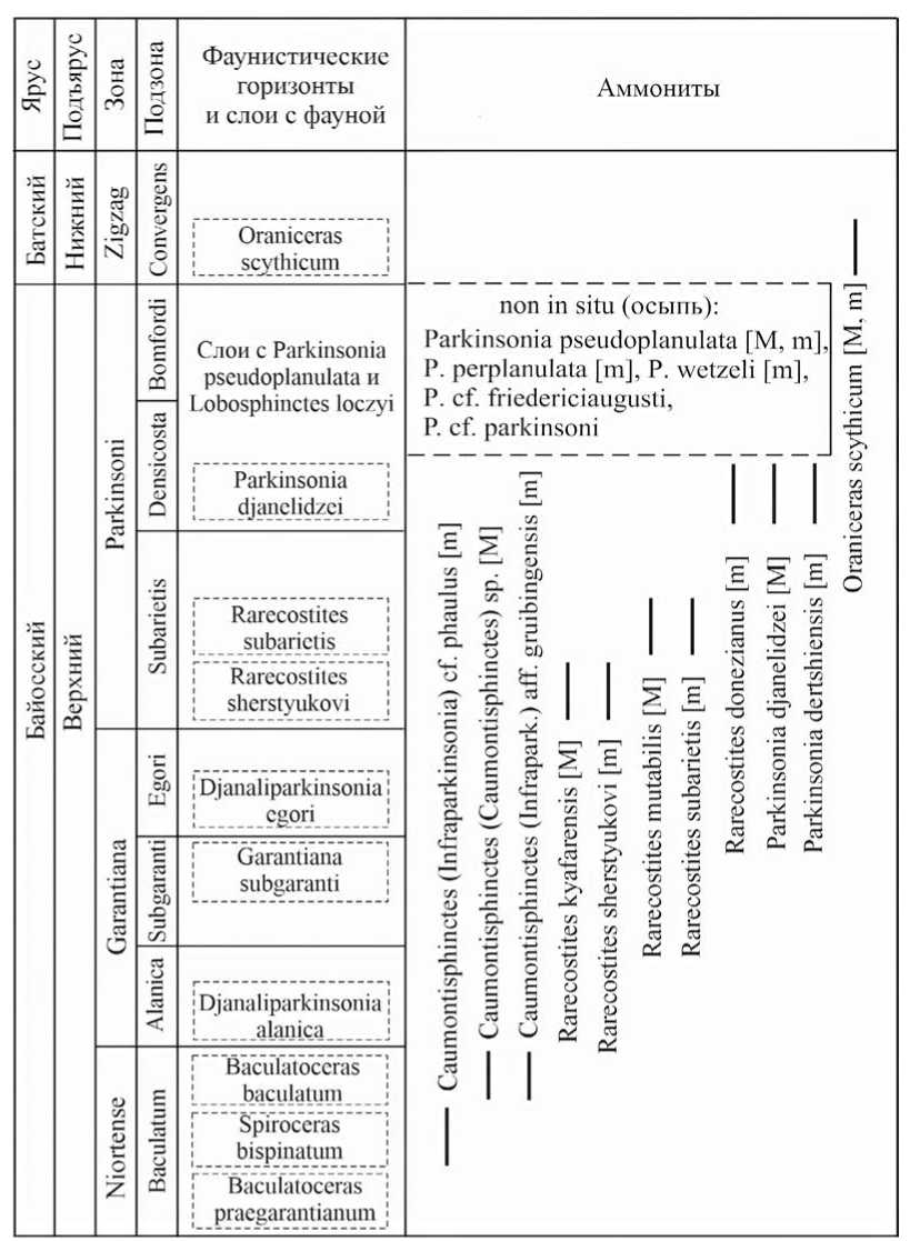Первые, очень редкие Parkinsoniidae появляются, в отличие от западноевропейских разрезов, только в самых верхах зоны Niortense, и полностью отсутствуют в перекрывающей зоне Garantiana. Но, начиная с подошвы зоны Parkinsoni, паркинсонииды внезапно появляются вновь, и в большом количестве, доходя до низов бата.