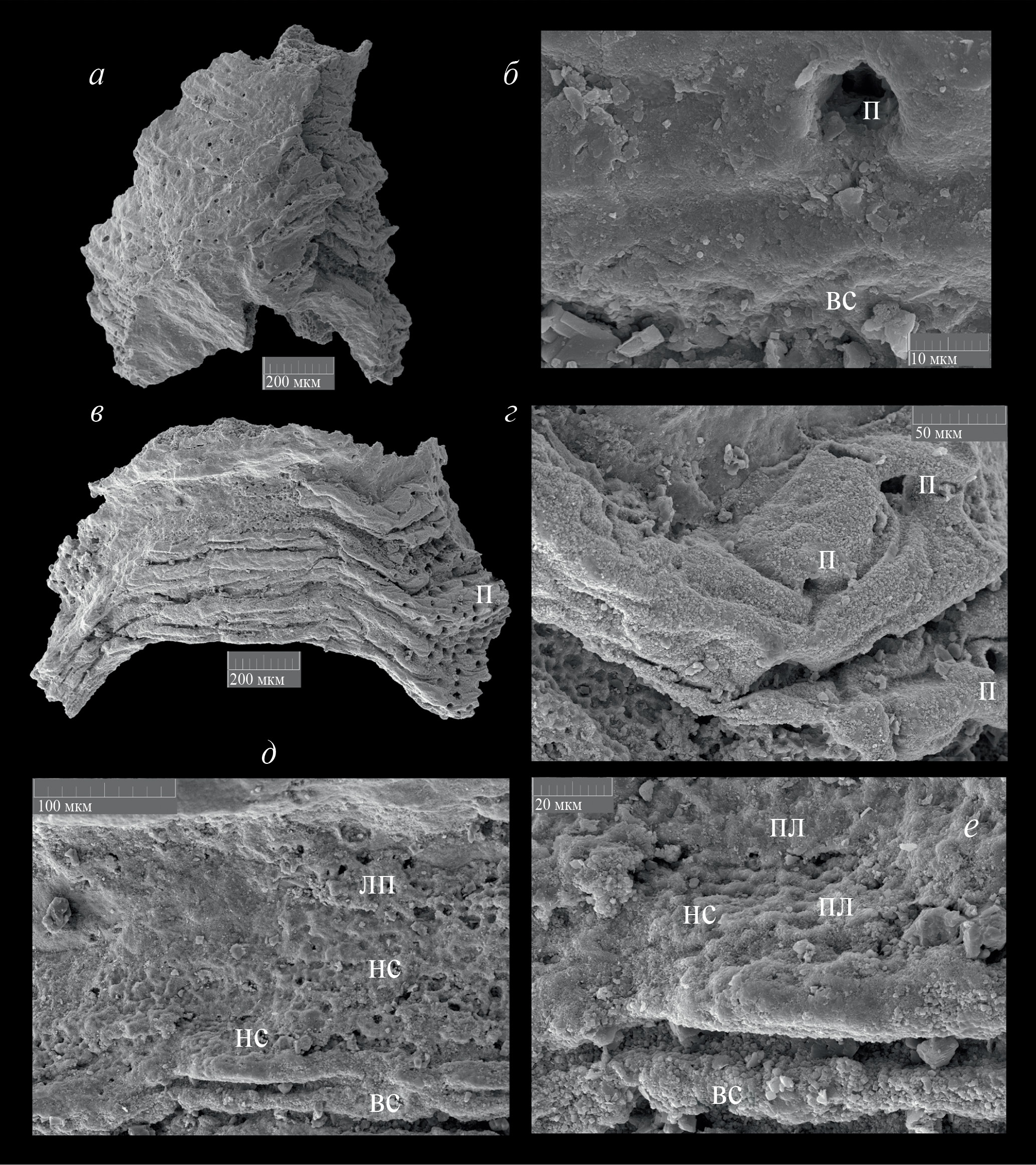 Рис. 1. Tannuolina pavlovi Kouchinsky, Bengtson et Murdock, 2010: а, б – экз. ПИН, № 5083/5264, выпуклые склериты (mitral): а – общий вид склерита сбоку, б – увеличенный фрагмент внутреннего слоя склерита, видна слоистость; в–е – экз. ПИН, № 5083/5182, уплощенные склериты (sellate): в – общий вид обломанного склерита, г–е – увеличенные фрагменты наружной поверхности склерита с крупными складками с порами и пористо-фавозитным рисунком; Сибирская платформа, разрез по прав. берегу р. Сухая Тунгуска ниже устья руч. Бечевник; томмотский ярус, костинская свита. Обозначения: вс – внутренний слой, лп – ложные поры, нс – наружный слой, п – поры, пл – пленка.