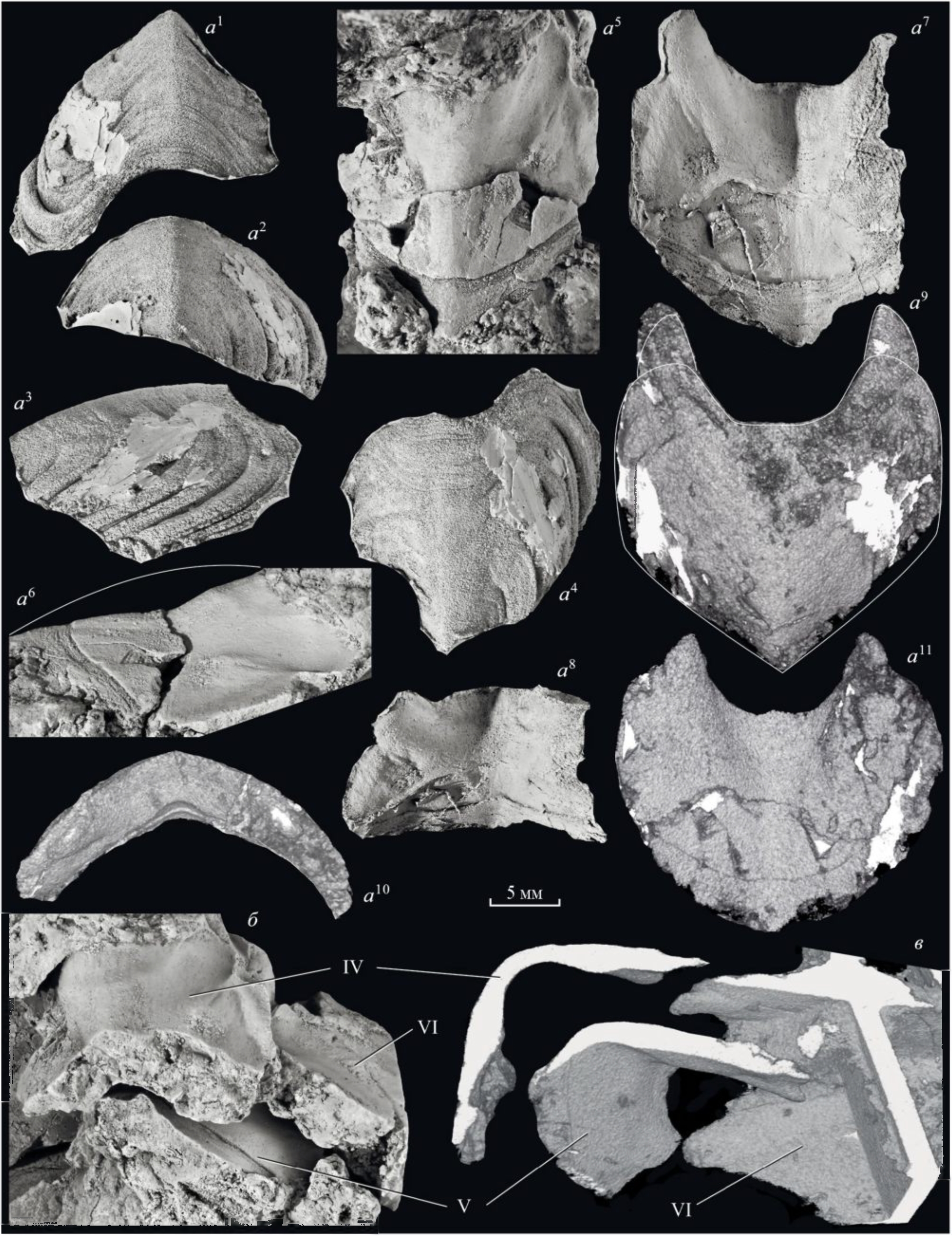 Рис. 1. Lekiskochiton crassus sp. nov., паратип ПИН, № 5538/7-293, ×2.5, тонкими линиями показаны реконструированные очертания щитков: а – щиток IV: a1–a4 – латексовый слепок дорсальной поверхности: a1 – наклонный вид спереди, a2 – вид сзади, a3 – вид справа, a4 – вид сверху; a5, a6 – отпечаток вентральной поверхности: a5 – вид сверху, a6 – вид справа (реконструировано с использованием фиг. a3); a7, a8 – латексовый слепок вентральной поверхности: вид снизу, вид спереди; a9–a11 – томография: a9 – вид с дорсальной стороны, a10 – вид спереди, a11 – вид с вентральной стороны; б – один из фрагментов, видны отпечатки вентральных поверхностей щитков IV, V и VI (для демонстрации положения щитка V, вентральная поверхность щитка IV показана фрагментарно); в – фрагмент томографии паратипа ПИН, № 5538/7-293, изображение инвертировано; Башкортостан, карьер Шахтау, местонахождение № 5538/7; ассельский ярус. Шкала 5 мм.