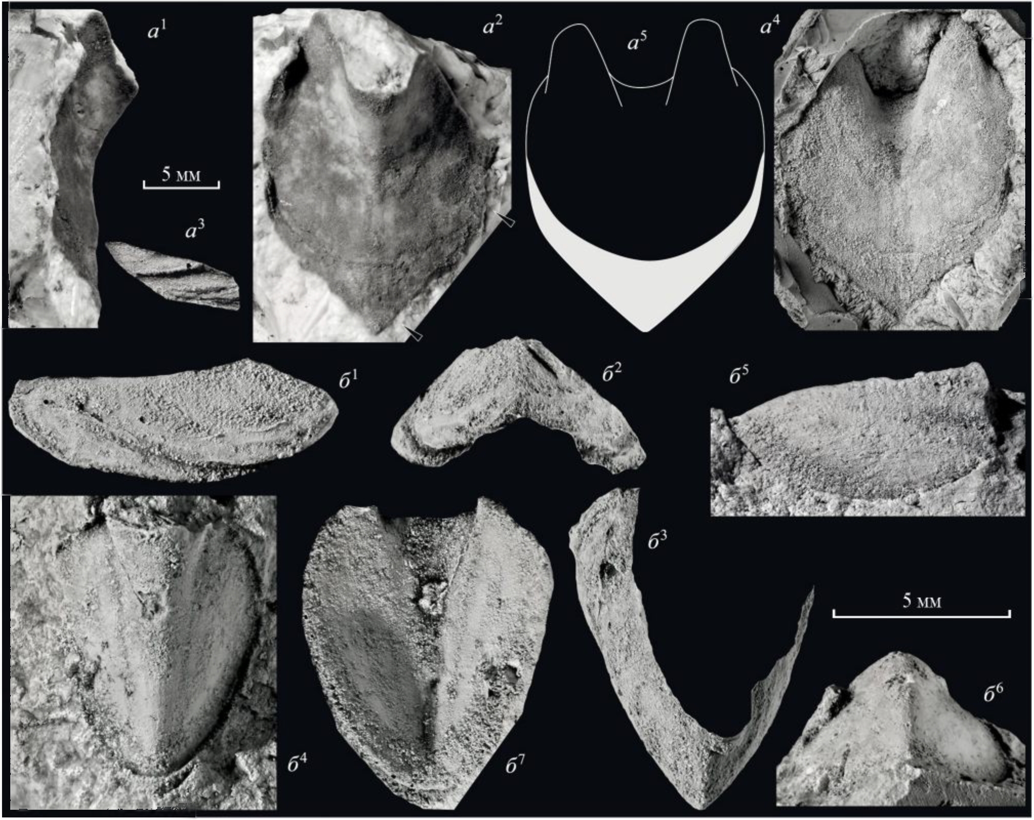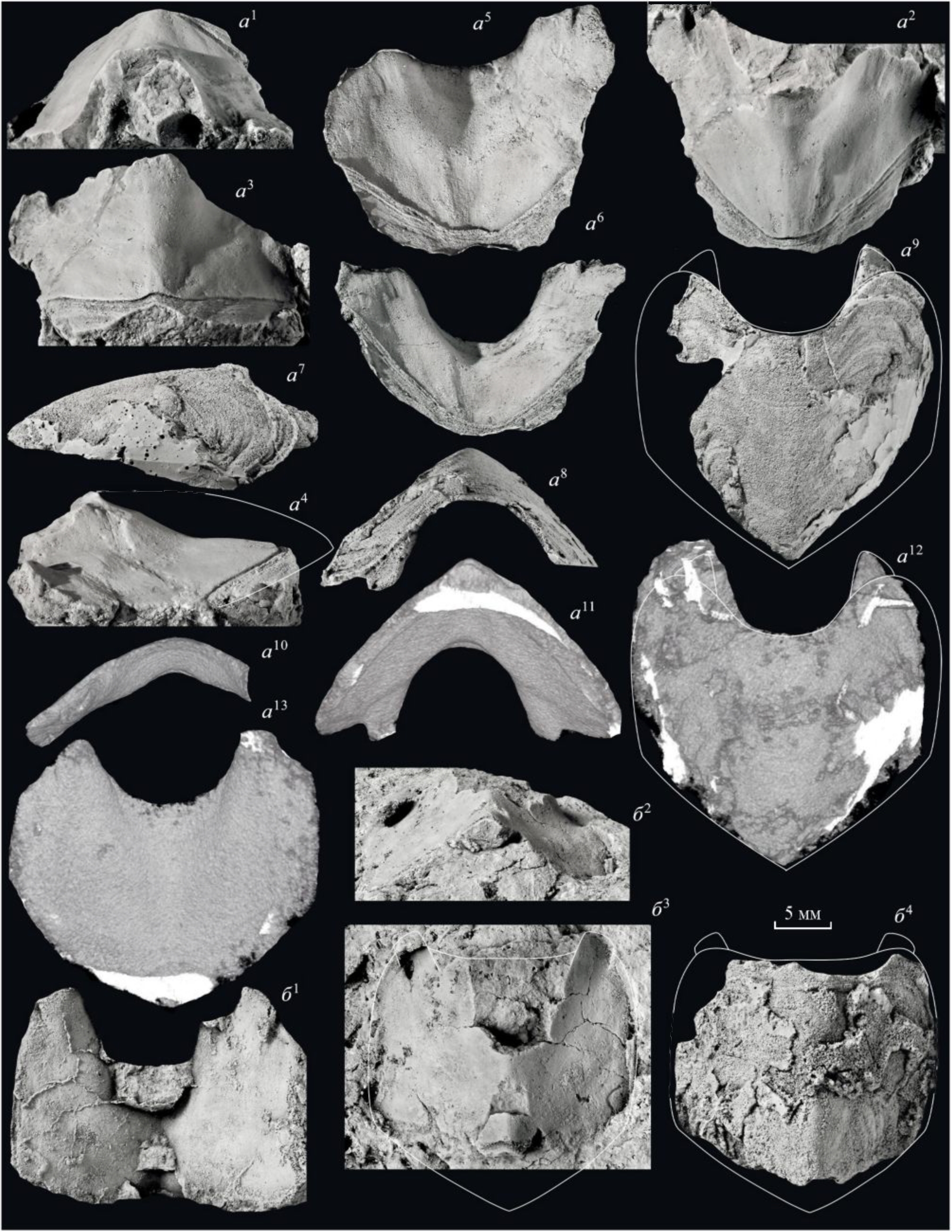Замечания. На основе различий в размерах и форме щитков из местонахождения № 5538/7 предлагается их возможная нумерация. Промежуточный щиток экз. ПИН, № 5538/7-292 (рис. 2, б1) отличается минимальной длиной по отношению к ширине, минимальным югальным синусом (очень широким и мелким, его реконструкция сделана на основе форм линий роста). Расстояние между апофизами максимальное, в то время как у хвостового щитка это расстояние минимальное. Резонно предположить, что это щиток II. В таком случае нумерация трех промежуточных щитков паратипа ПИН, № 5538/7-293, расположенных в породе один над другим (рис. 1, б, в), может соответствовать одному из порядков: III–V, IV–VI или V–VII. Верхний из них, как показано на рис. 5, г1, обладает примерно таким же расстоянием между апофизами, как на щитке II. Отличия в остальных признаках свидетельствуют о том, что между верхним щитком и щитком II должен был размещаться как минимум еще один. С другой стороны, щиток, развернутый в паратипе в противоположную сторону от остальных двух (рис. 1, б, в) имеет довольно широко расставленные апофизы по сравнению с хвостовым щитком (рис. 5, г3). Кроме того, экземпляр из местонахождения № 5538/10 демонстрирует максимально сближенные апофизы (рис. 5, б), и он может быть щитком VII. Таким образом, промежуточные щитки паратипа, скорее всего, отвечают порядку IV–VI (рис. 5, г). В предложенном ряду наблюдаются последовательные изменения угла V-образного заднего края от 115° на щитке II до 90° на щитке VII, увеличение их килеватости в направлении к хвостовому щитку, а также закономерное изменение ширины щитков с максимальной шириной в средней части тела (рис. 5).