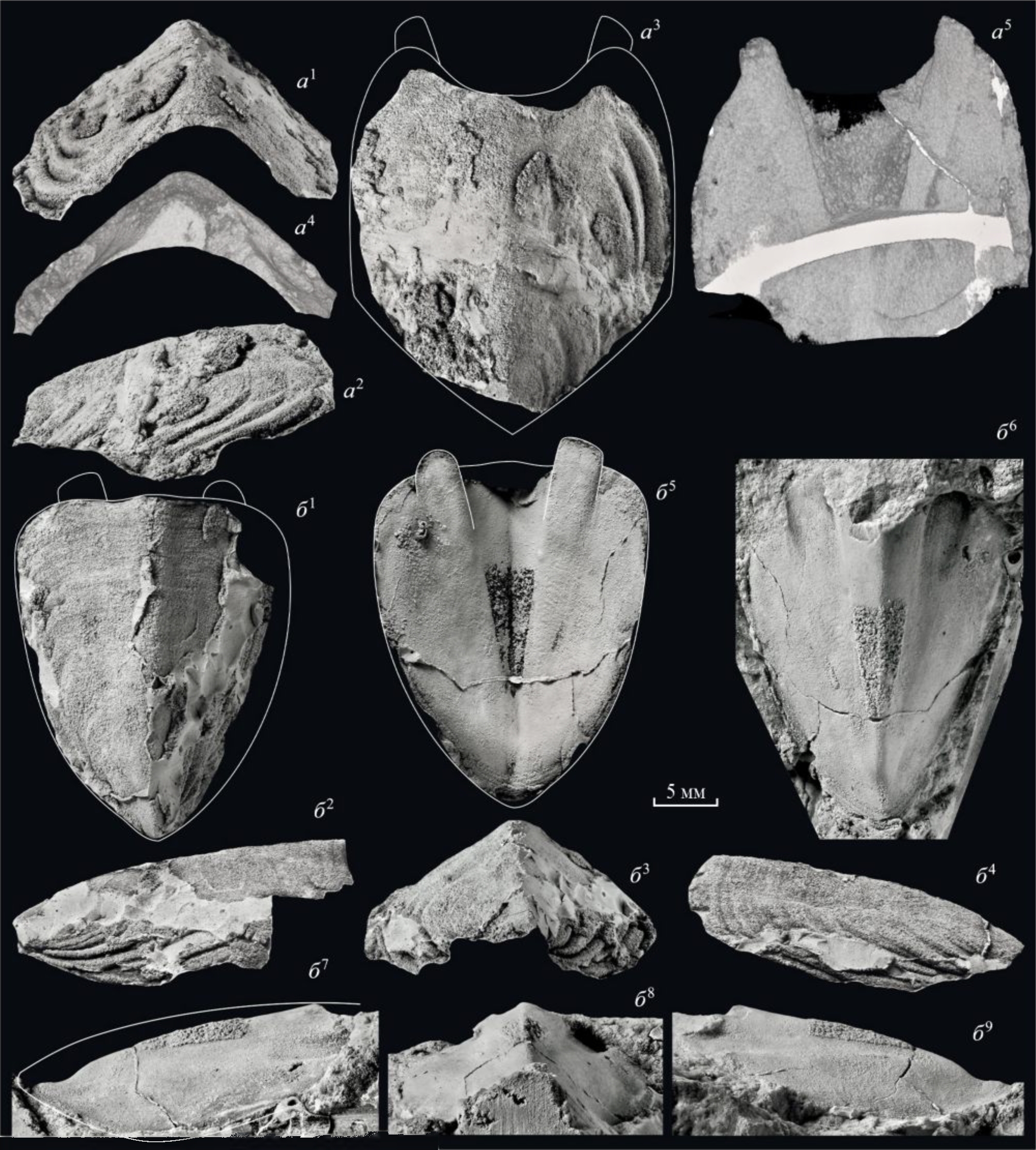 Рис. 3. Lekiskochiton crassus sp. nov., ×2.5, тонкими линиями показаны реконструированные очертания щитков: a – паратип ПИН, № 5538/7-293, щиток VI: a1–a3 – латексовый слепок дорсальной поверхности: a1 – вид спереди, a2 – вид справа, a3 – вид сверху; a4, a5 – томография: a4 – вид спереди, a5 – вид с вентральной стороны; б – голотип ПИН, № 5538/7-294, щиток VIII: б1–б4 – латексовый слепок дорсальной поверхности: б1 – вид сверху, б2 – вид справа, б3 – вид сзади, б4 – вид слева; б5 – латексовый слепок вентральной поверхности; б6–б9 – отпечаток вентральной поверхности: б6 – вид сверху, б7 – вид справа, б8 – вид сзади, б9 – вид слева; Башкортостан, карьер Шахтау, местонахождение № 5538/7; ассельский ярус. Шкала 5 мм.