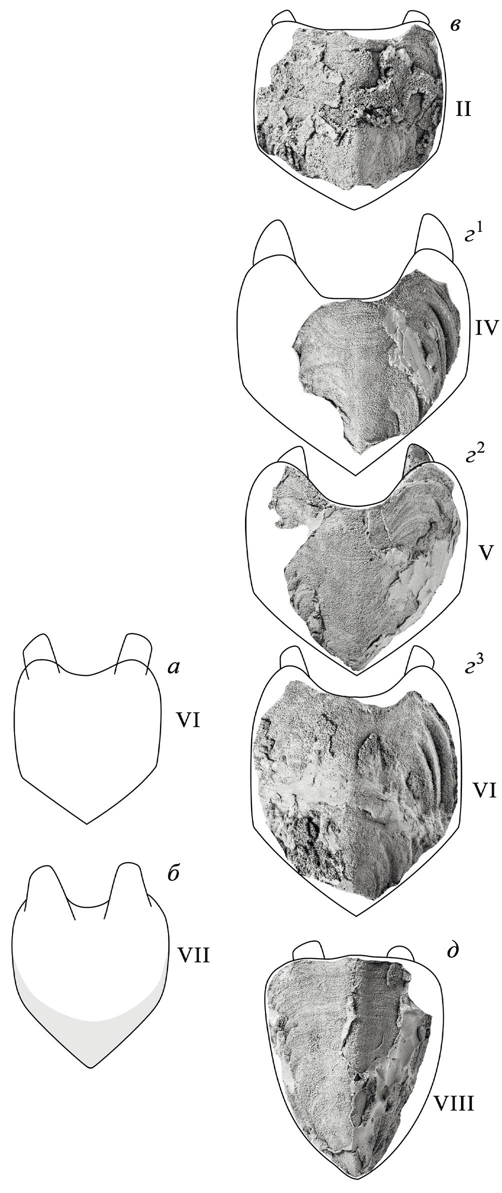 Рис. 5. Нумерация щитков Lekiskochiton crassus sp. nov., показаны реконструированные очертания щитков, ×1.5: a – экз. № 5538/10-506, щиток VI; б – экз. ПИН, № 5538/10-396, щиток VII; в – экз. ПИН, № 5538/7-292, щиток II; г1–г3 – паратип ПИН, № 5538/7-293: г1 – щиток IV, г2 – щиток V, г3 – щиток VI; д – голотип ПИН, № 5538/7-294, щиток VIII.