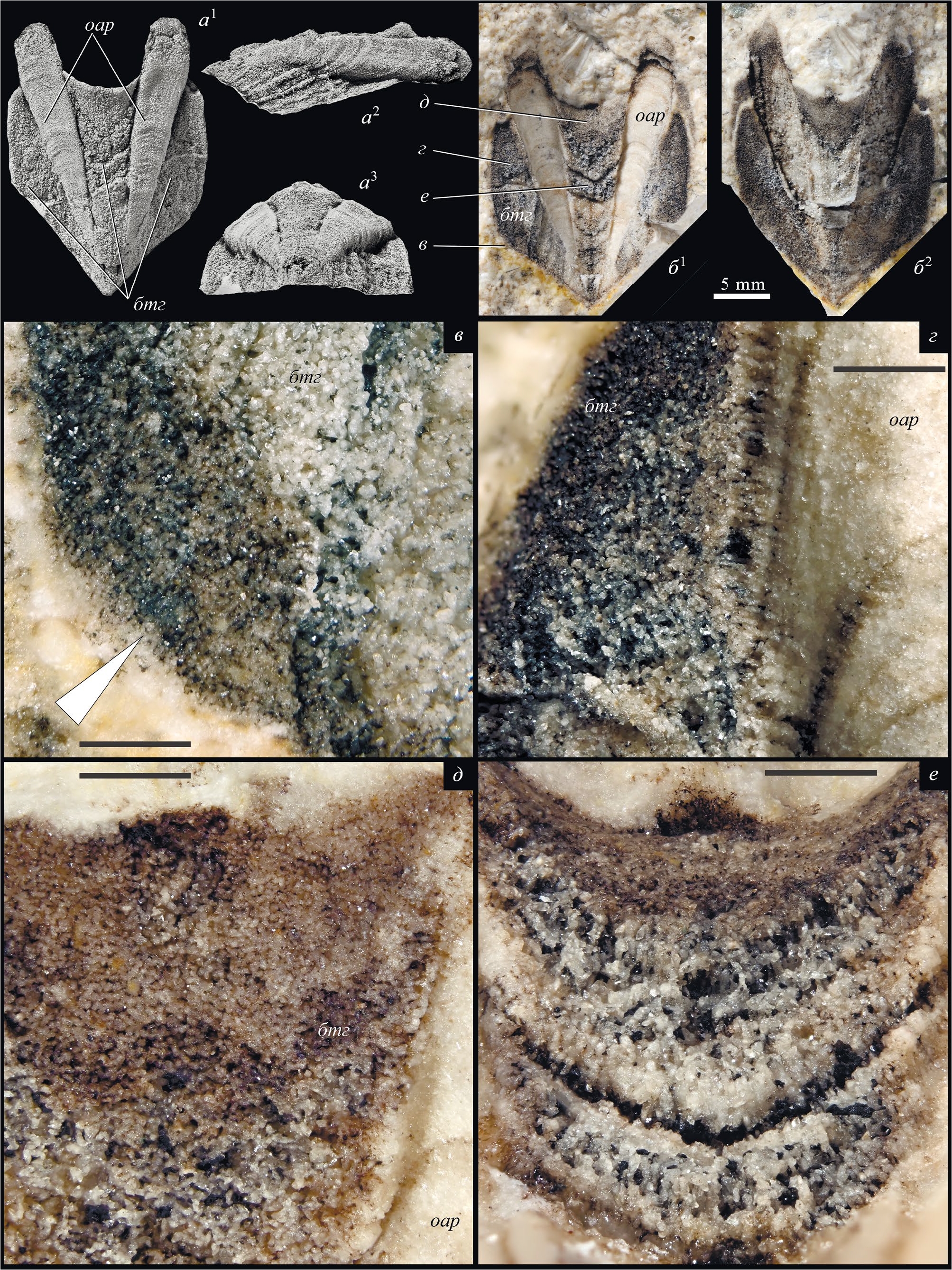 Рис. 6. Lekiskochiton crassus sp. nov., экз. ПИН, № 5538/10-506, форма сохранности промежуточного щитка: a – латексовый слепок поперечного скола со стороны дорсальной поверхности: вид сверху, вид справа, вид сзади; ×2.5, шкала 5 мм; б1 – поперечный скол со стороны дорсальной поверхности, ×2.5, показаны участки биоморфозы кальцита по тегментуму, увеличенные на фиг. в–е; б2 – поперечный скол со стороны вентральной поверхности с биоморфозой кальцита по тегментуму, ×2.5; в–е – увеличенные фрагменты биоморфозы кальцита по тегментуму на отпечатке дорсальной поверхности, ×20, шкала 1 мм: в – тонкая скульптура на краю латерального поля, просвечивающая сквозь корку кальцита; г – столбчатая структура на поперечном сколе биоморфозы кальцита по тегментуму на границе латерального поля и отпечатка артикуламентума; д – столбчатая структура на продольном сколе биоморфозы кальцита по тегментуму в передней части югальной области; е – столбчатая структура на поперечном сколе биоморфозы кальцита по тегментуму в центральной части югальной области; Башкортостан, карьер Шахтау, местонахождение № 5538/10; сакмарский ярус, стерлитамакский горизонт. Обозначения: бтг – биоморфза кальцита по тегментуму, оар – отпечаток растворенного артикуламентума.