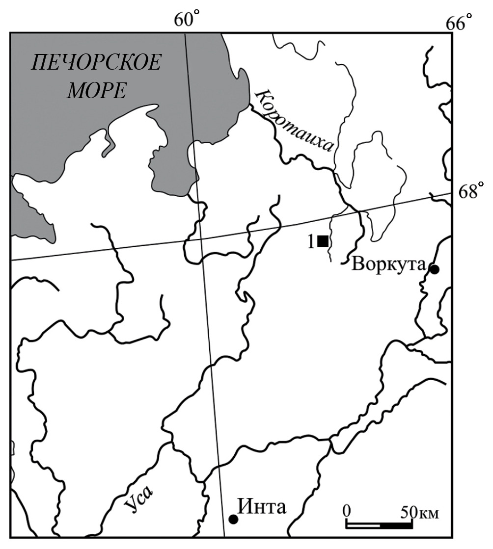 Разрез силура находится в центральной части гряды Чернова, расположенной в Тимано-Североуральском регионе, в 80 км к северо-северо-западу от г. Воркута (рис. 1). Гряда Чернова представляет собой узкую приразломную горстообразную структуру (Юдин, 1994). Самыми древними в разрезе силура этого района являются отложения венлока, выходящие на поверхность в бассейне р. Падимейтывис. Вниз по течению р. Падимейтывис венлокские отложения перекрываются отложениями лудлова. Первая стратиграфическая схема расчленения силурийских отложений района была разработана Г.А. Черновым (1964, 1972). В последующие годы стратиграфия силура неоднократно пересматривалась (Модзалевская, 1980; Антошкина, Безносова, 1988; Matveev et al., 2000; Безносова и др., 2014). Сейчас за основу расчленения силурийских отложений в бассейне р. Падимейтывис принята стратиграфическая схема Урала (Объяснительная записка…, 1994) с уточнениями (Безносова и др., 2020). Материалом для данной статьи послужили образцы пород, послойно собранные В.А. Матвеевым, работавшим на гряде Чернова в 2017 г.