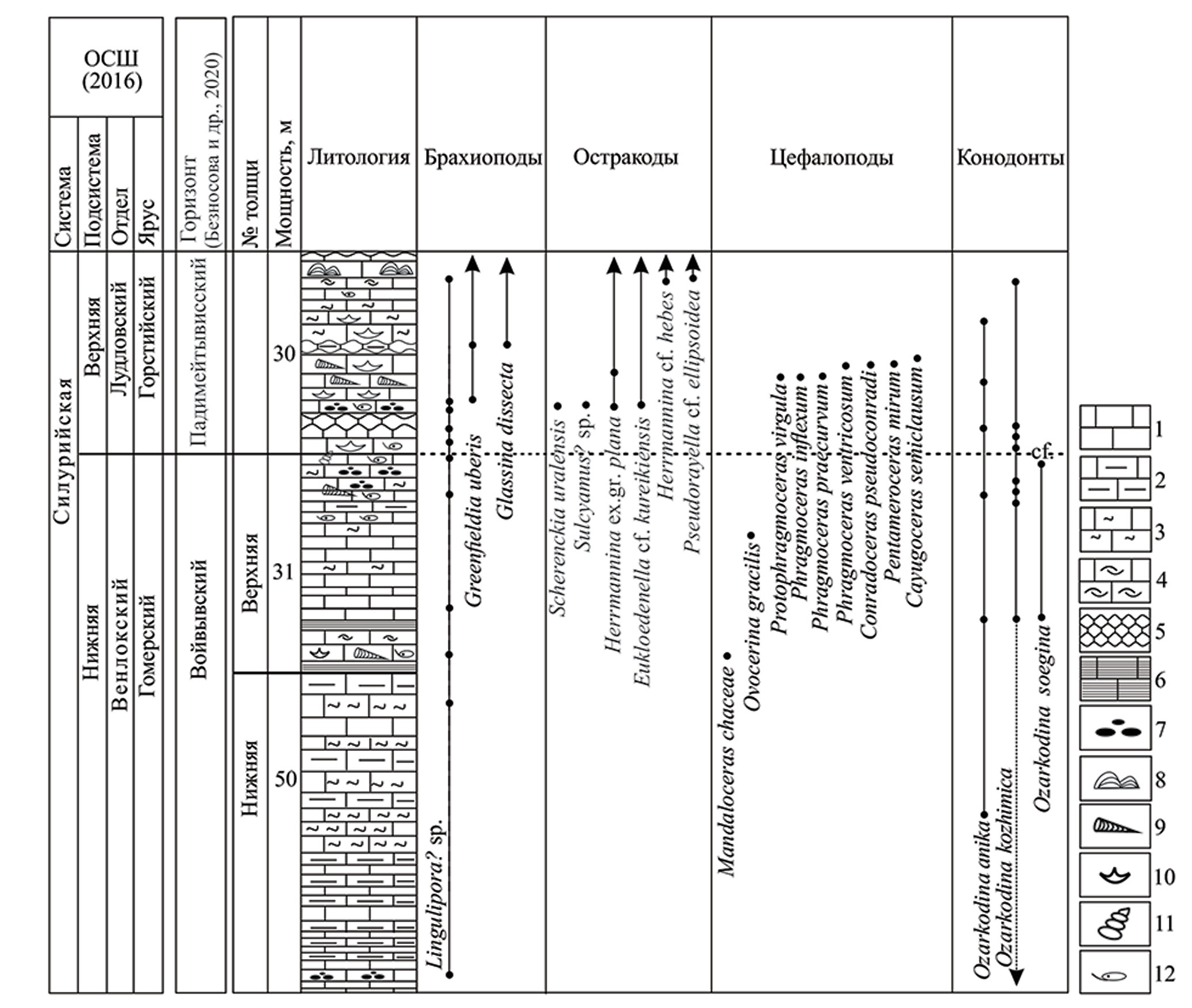 В разрезе силура стратиграфический интервал, заключающий лингулид, которым посвящена статья, охватывает верхнюю часть венлока (войвывский горизонт и гомерий) и нижнюю часть падимейтывисского горизонта лудлова (горстия), общей мощностью 100 м. По условиям осадконакопления и распространению органических остатков рассматриваемый интервал подразделен на две толщи (рис. 2).