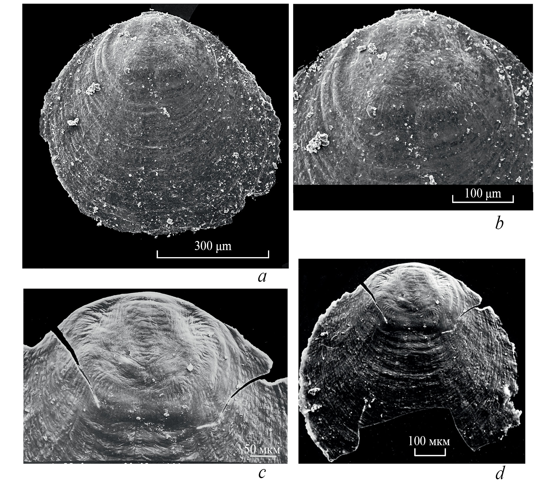 Снаружи в задней части створок отчетливо выделяются протегулум и брефическая раковина (табл. VII, фиг. 1а, 2–5, 6а; табл. VIII, фиг. 1а–1г). Протегулум округлый, высотой 20–30 мкм, приподнят над створкой, создавая примакушечную ее часть, с диаметром 80–100 мкм; отделен от брефической раковины отчетливой бороздкой. В середине он немного вдавлен, а на его боковых сторонах иногда сохранились тонкие радиальные струйки (табл. VII, фиг. 4а, 4б; табл. VIII, фиг. 1г). Брефическая раковина округленно-овальных очертаний, шириной около 300 мкм, длиной 170–180 мкм, с гладкой поверхностью; иногда на ней видны две–три плохо заметные концентрические линии. От взрослой части брефическую раковину отделяет заметное сгущение концентрических ребрышек, оконтуривающих ее края. Взрослая поверхность спинной створки несет несколько концентрических пластин 40–50 мкм шириной, передние края которых слегка утолщены и приподняты (табл. VII, фиг. 6г); пластины покрыты частыми многочисленными тонкими (около 10–15 мкм шириной) и очень тонкими (около 1 мкм шириной) тесно расположенными концентрическими струйками (табл. VII, фиг. 6а–6г; табл. VIII, фиг.2). Иногда видны радиальные ребрышки, тоже очень тонкие, лучше заметные (или лучше сохранившиеся) на боковых сторонах. На взрослой наружной поверхности также спорадически (гораздо реже, чем на внутренней поверхности) разбросаны поры с диаметром менее микрона (табл. VII, фиг. 6б, 6в).