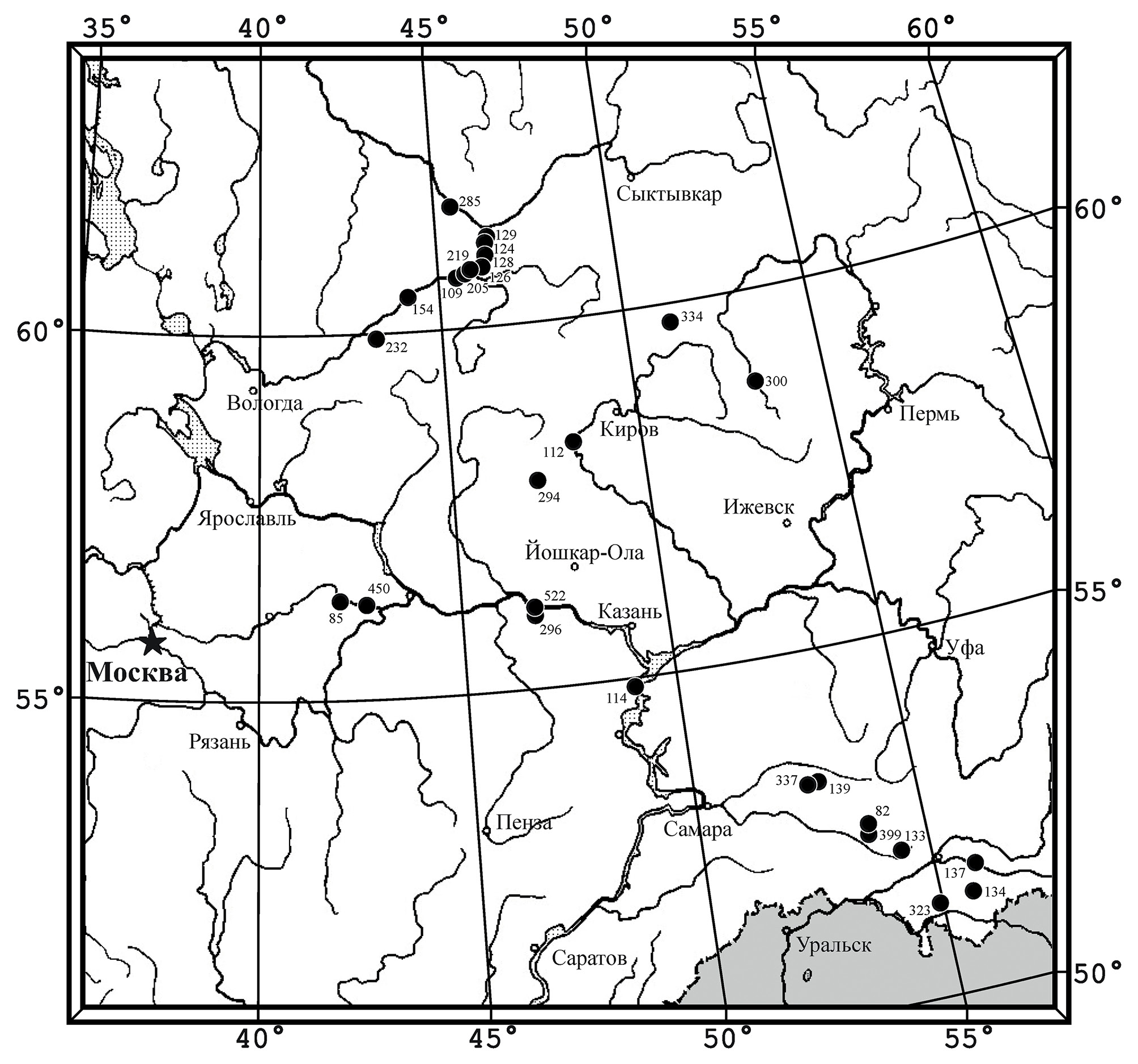 Рис. 2. Карта расположения местонахождений остеодерм позднепермских парейазавров Восточной Европы: 82 – Пронькино; 85 – Вязники-1, Быковка; 109 – Мутовино, Марьюшкина Слуда-C, Микулино, Пуртовино, Чермянино; 112 – Котельнич, Агафоново, Чижи; 114 – Семин Овраг-1, Ключевой Овраг; 124 – Соколки, Завражье; 126 – Аристово; 128 – Савватий, Элеонора; 129 – Болтинская; 133 – Адамовка; 134 – Блюменталь-3, Блюменталь-5, Ключевка; 137 – Вязовка-1; 139 – Бабинцево-1; 154 – Кочевала-1, Потеряха-2; 205 – Климово-1; 219 – Саларево; 232 – Обирково; 285 – Раша; 294 – Пурлы, Куверба; 296 – Вомба-Кассы; 300 – Аверинское-1, Аверинское-3; 323 – Боевой-1; 334 – Орлецы, Чащенка; 337 – Преображенка-1A, Преображенка-2; 399 – Солоповка-2; 450 – Гороховец, Жуков Овраг-1B; 522 – Токари-2.