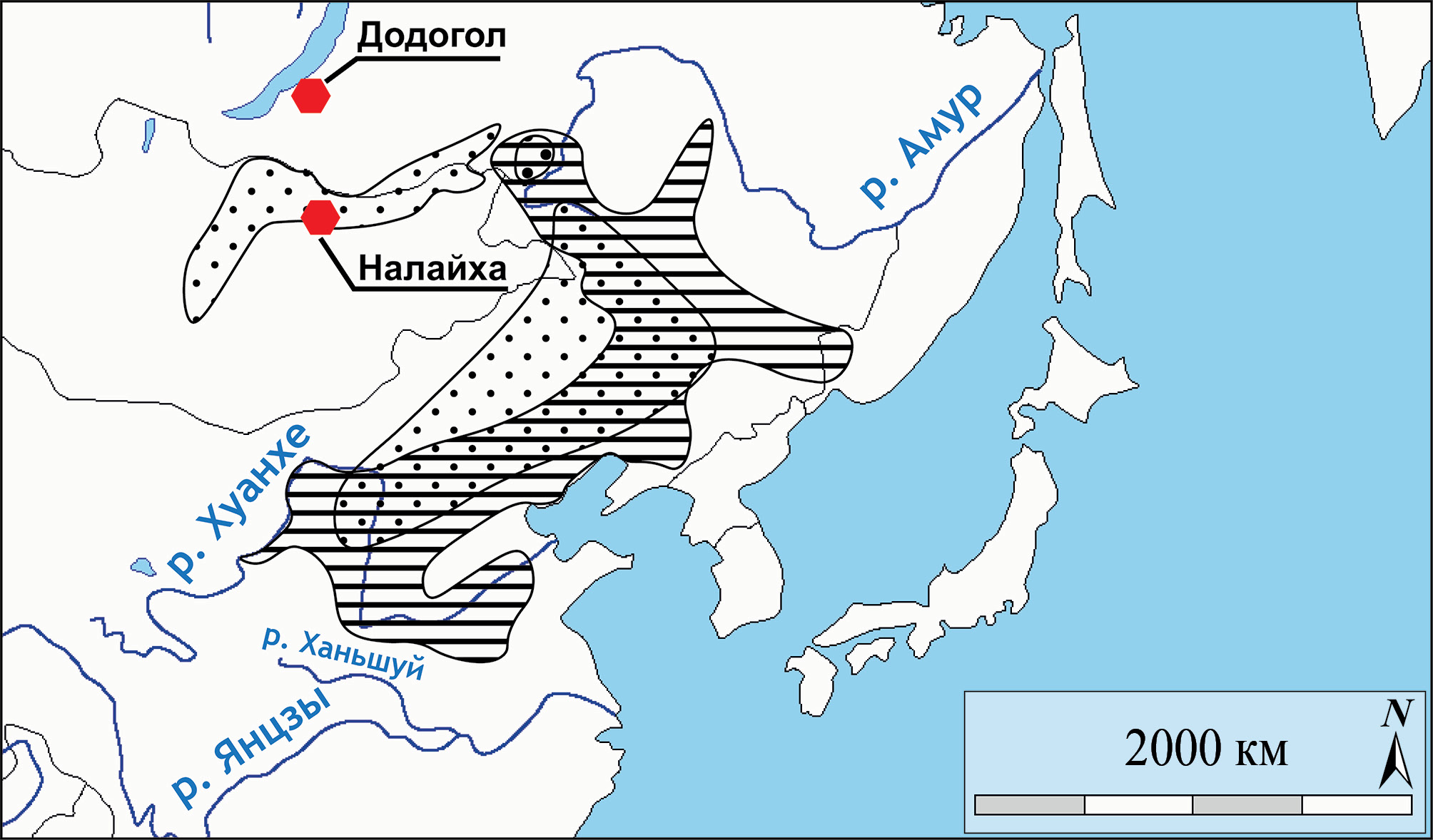 Рис. 1. Современные ареалы маньчжурских (горизонтальные линии) и даурских (точки) цокоров (по: Соколов, Орлов, 1980; Puzachenko et al., 2013; Bazhenov, Pavlenko, 2020). Красными шестиугольниками обозначены местонахождения Налайха и Додогол.