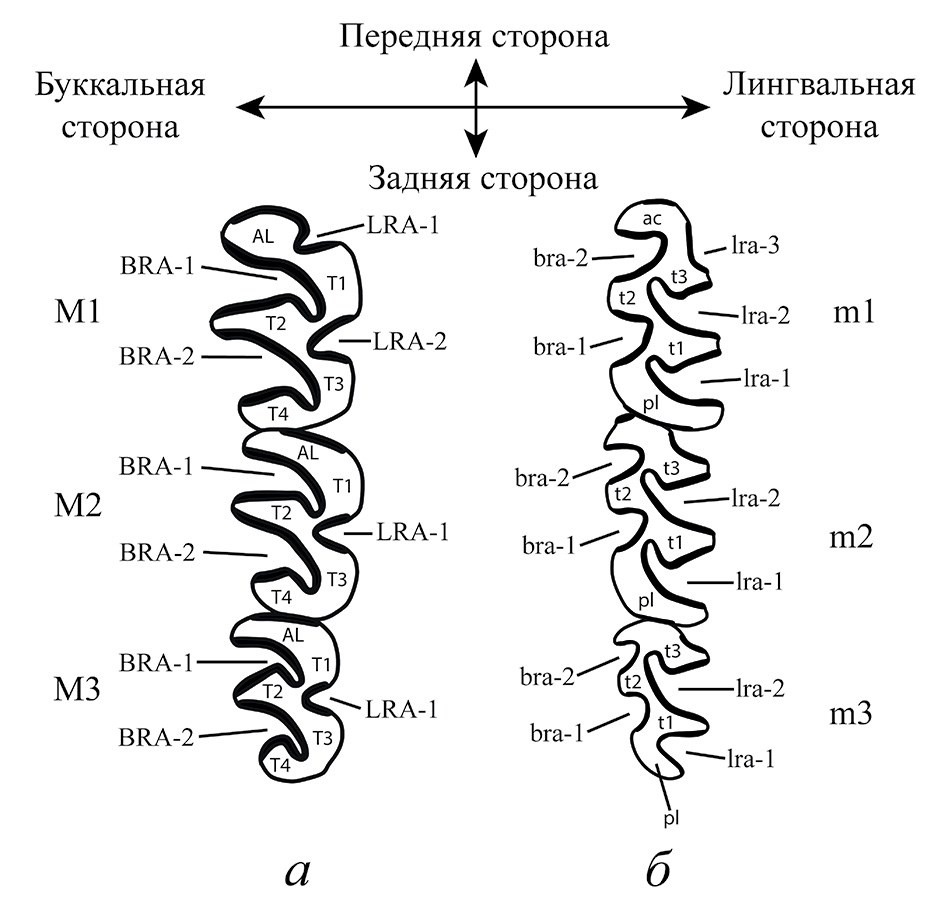 Рис. 2. Схема с обозначениями структурных элементов жевательной поверхности верхних (а) и нижних (б) моляров у цокоров. Обозначения: BRA/bra – входящие буккальные углы; LRA/lra – входящие лингвальные углы; T/t – дентиновые призмы; AL – передние призмы верхнечелюстного ряда; ac – передняя часть нижнего первого моляра; pl – задняя призма нижнечелюстно ряда.