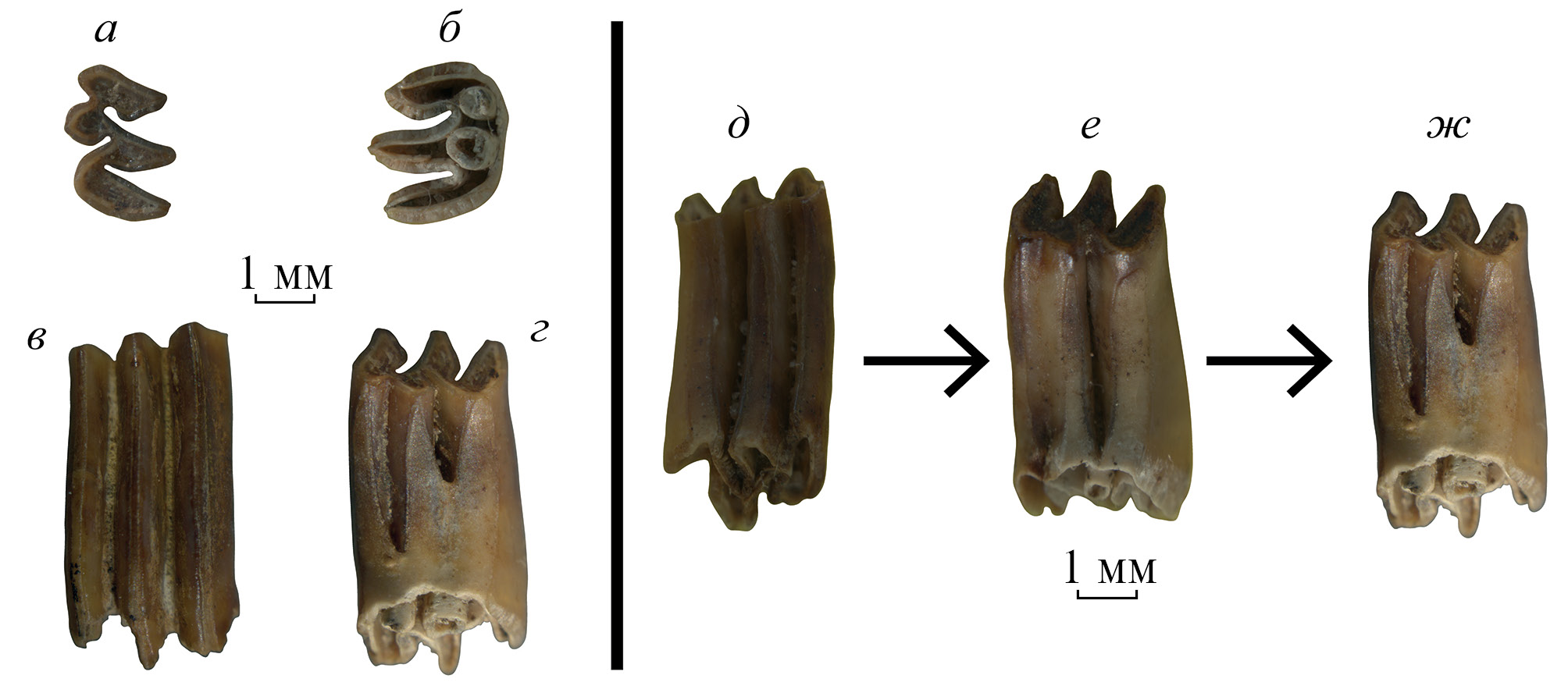 Рис. 4. Siphneus tolaensis sp. nov.: а–г – голотип ГИН, № 1104/107, левый m2: a – вид с жевательной стороны; б – вид с альвеолярной стороны; в – вид с лингвальной стороны; г – вид с буккальной стороны; д–ж – последовательные онтогенетические стадии на примере буккальной стороны m2 экз. ГИН, №№ 1104/105, 107, 109.