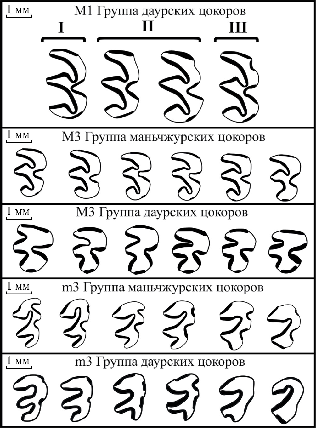 Нижние третьи моляры в обеих группах обладают высокой морфологической вариативностью. В группе даурских цокоров присутствуют морфотипы с хорошо выраженной задней призмой и морфотипы, у которых задняя призма полностью редуцирована. Также варьирует число и выраженность входящих углов за счет редукции первого входящего угла у части морфотипов. Буккальные углы практически не проявлены и зачастую маркируются только по участкам эмали или полностью отсутствуют. У маньчжурских цокоров буккальные углы, напротив, всегда в той или иной степени проявлены. Задняя призма, как и у даурских цокоров, может быть проявлена в одних морфотипах и полностью редуцирована в других. За счет подобной конфигурации входящих углов и призм дентиновые поля у даурских цокоров слиты в большей степени, чем у маньчжурских.