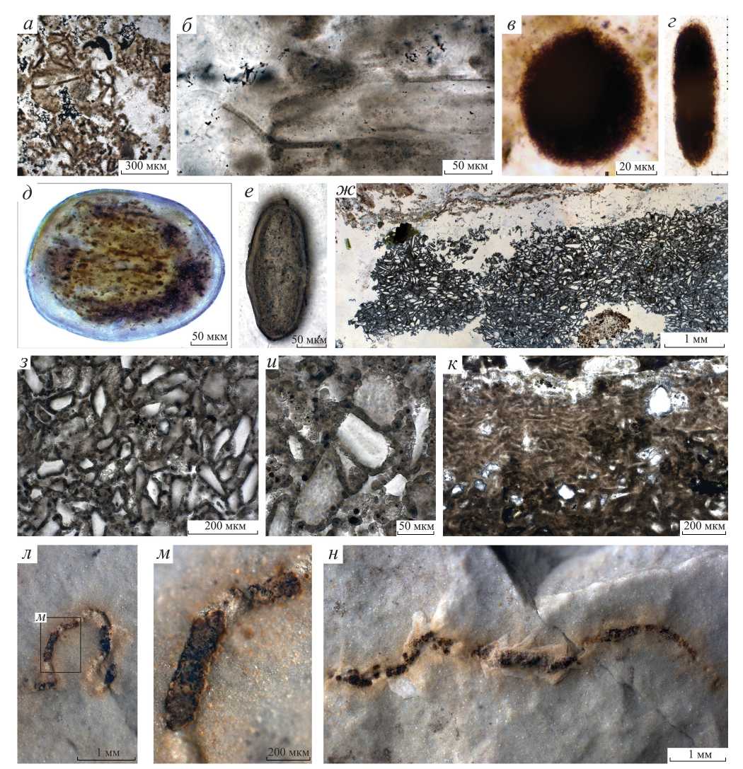 Рис. 2. Минерализованные органические остатки, псевдофоссилии и проблематика в кремнях свиты Зуун-Арц: а, б – одиночные полые чехлы Siphonophycus внутри сильно разложенного цианобактериального мата с обилием органико-формирующих пелоидных частиц; в, г – Spumasina- и Navifusa-подобные органические пелоиды; д, е – поверхностные ооидные зерна с ядрами в виде округлых и эллипсоидальных фрагментов деструктурированных микробных матов; ж, з – мозаичные агрегаты плотно упакованных обломочных зерен кварца, имитирующие ячеистые клеточные структуры; и – кварцевые зерна, окаймленные оторочками сферолитов; к – прерывисто слоистые “червячковые” структуры с обилием пелоидных частиц; л–н – углеродистые компрессии нитчатых фоссилий на поверхностях аргиллитовых слоев.