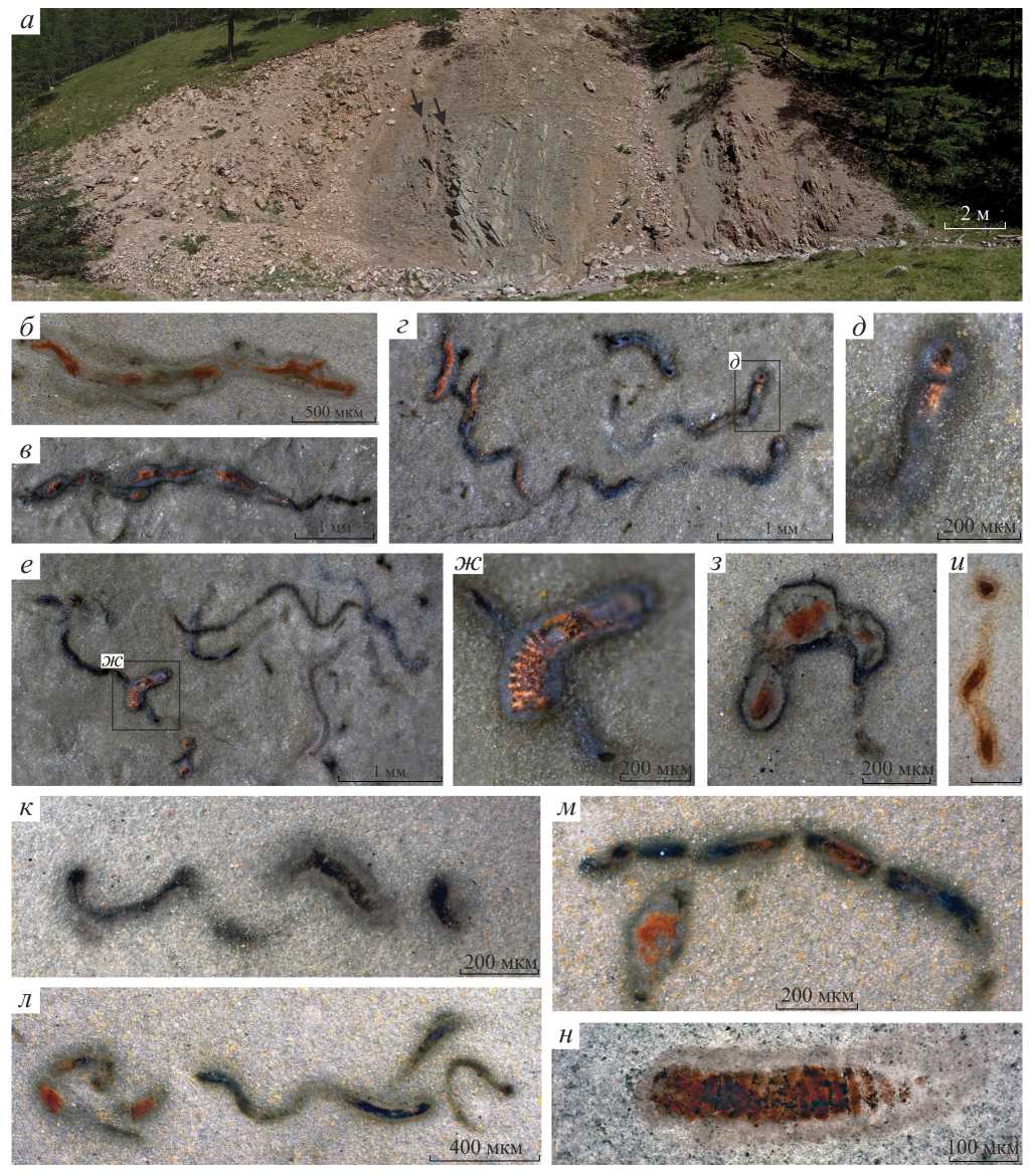 Рис. 3. Микрофоссилии в аргиллитах свиты Зуун-Арц: а – обнажение аргиллитов с одиночными горизонтами кремней и фосфоритов (показаны стрелками) в базальной части свиты Зуун-Арц, долина р. Цаган-Гол; б–н – нитчатые микрофоссилии: б, з–н – в петрографических шлифах строго параллельно слоистости; в–ж – на поверхности аргиллитовых слоев. Масштабная линейка на (и) равна 200 мкм.